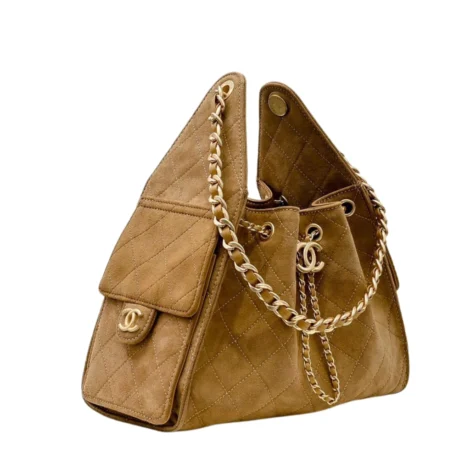 Chanel Quilted Suede Drawstring Bucket Bag with Gold Chain Hardware