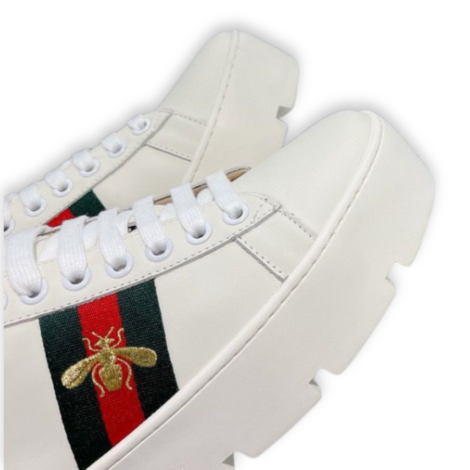 Gucci Ace Platform Sneaker in White Leather with Web Stripe and Bee