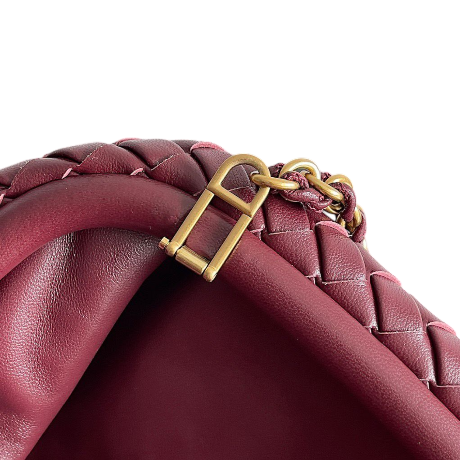 This refined Bottega Veneta clutch is crafted from supple burgundy leather using the house’s signature Intrecciato weaving technique. Designed with a softly structured silhouette, it features a flap closure and a slim chain strap interwoven with leather, allowing for elegant shoulder or clutch wear. The minimalist aesthetic highlights Bottega Veneta’s exceptional craftsmanship and timeless luxury appeal.