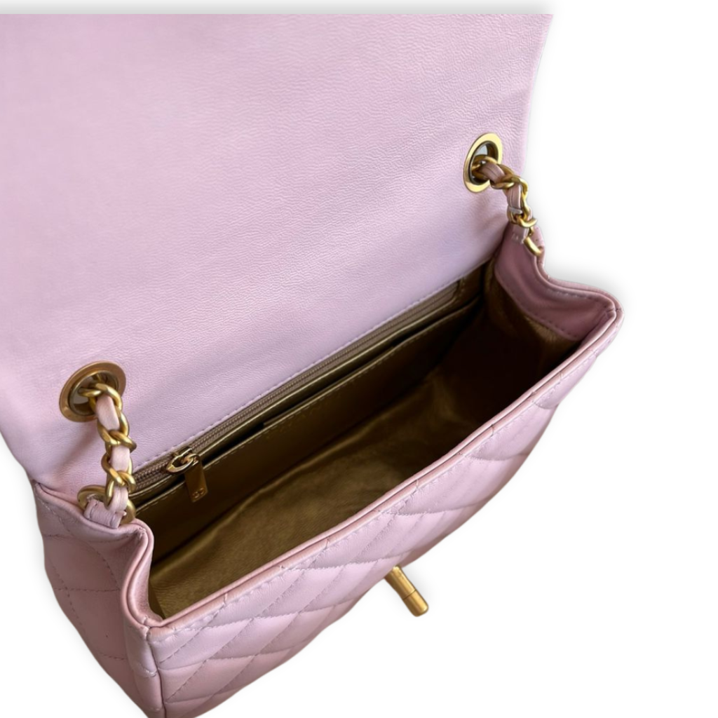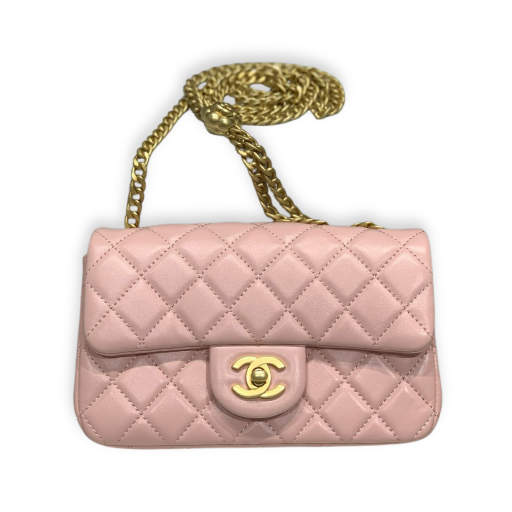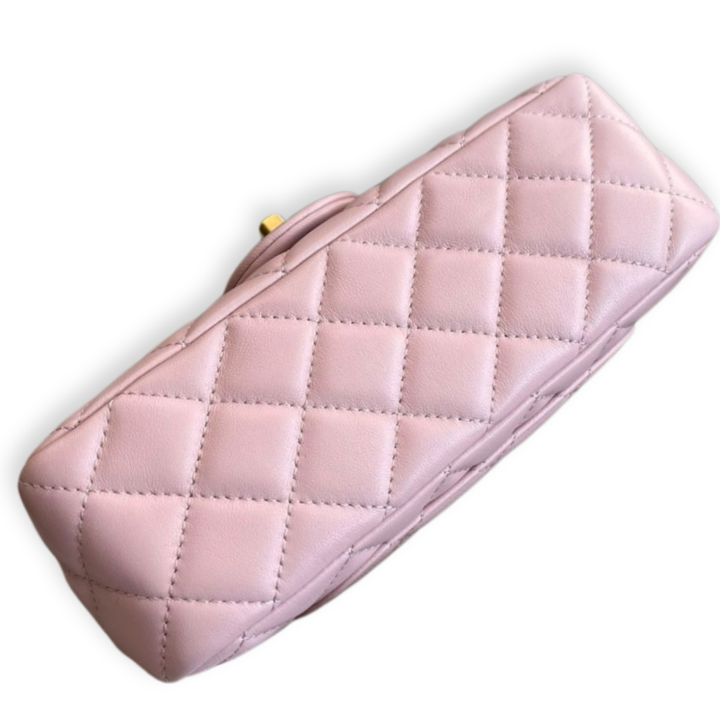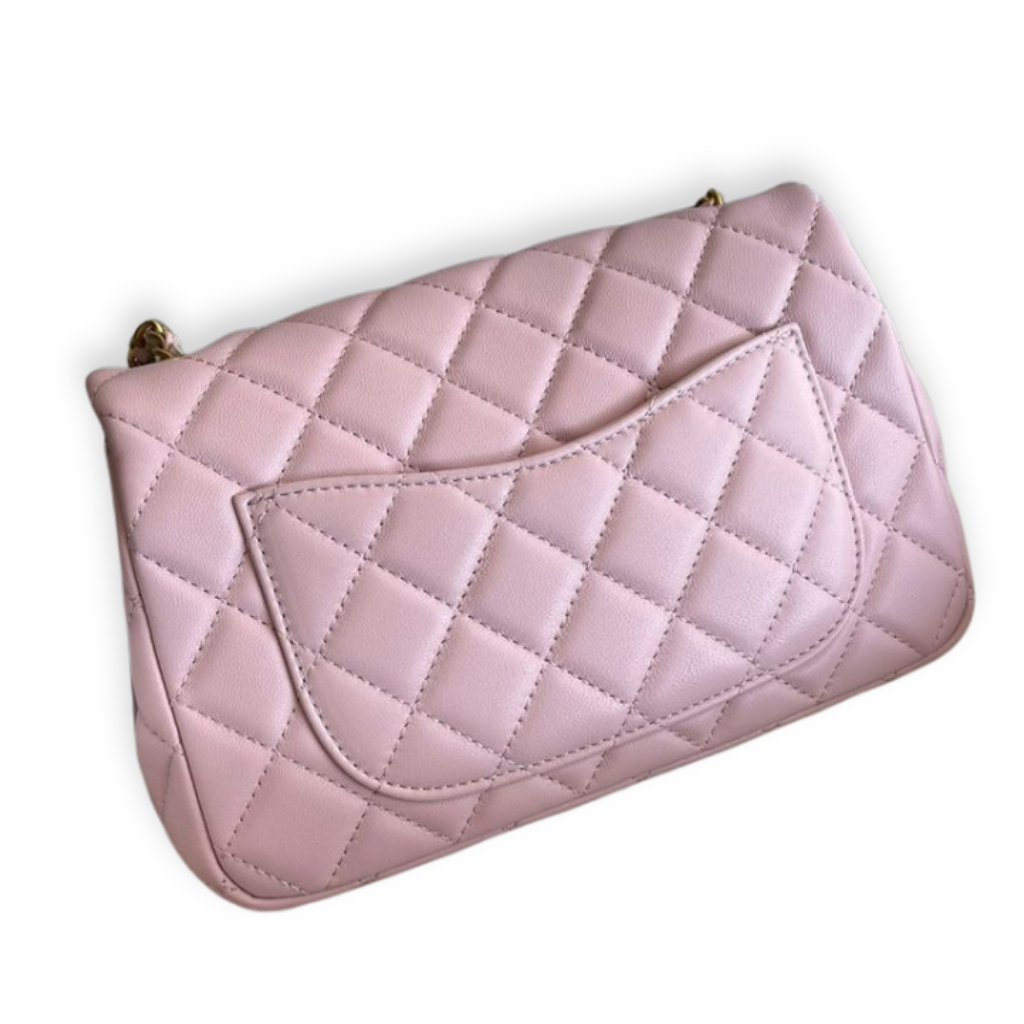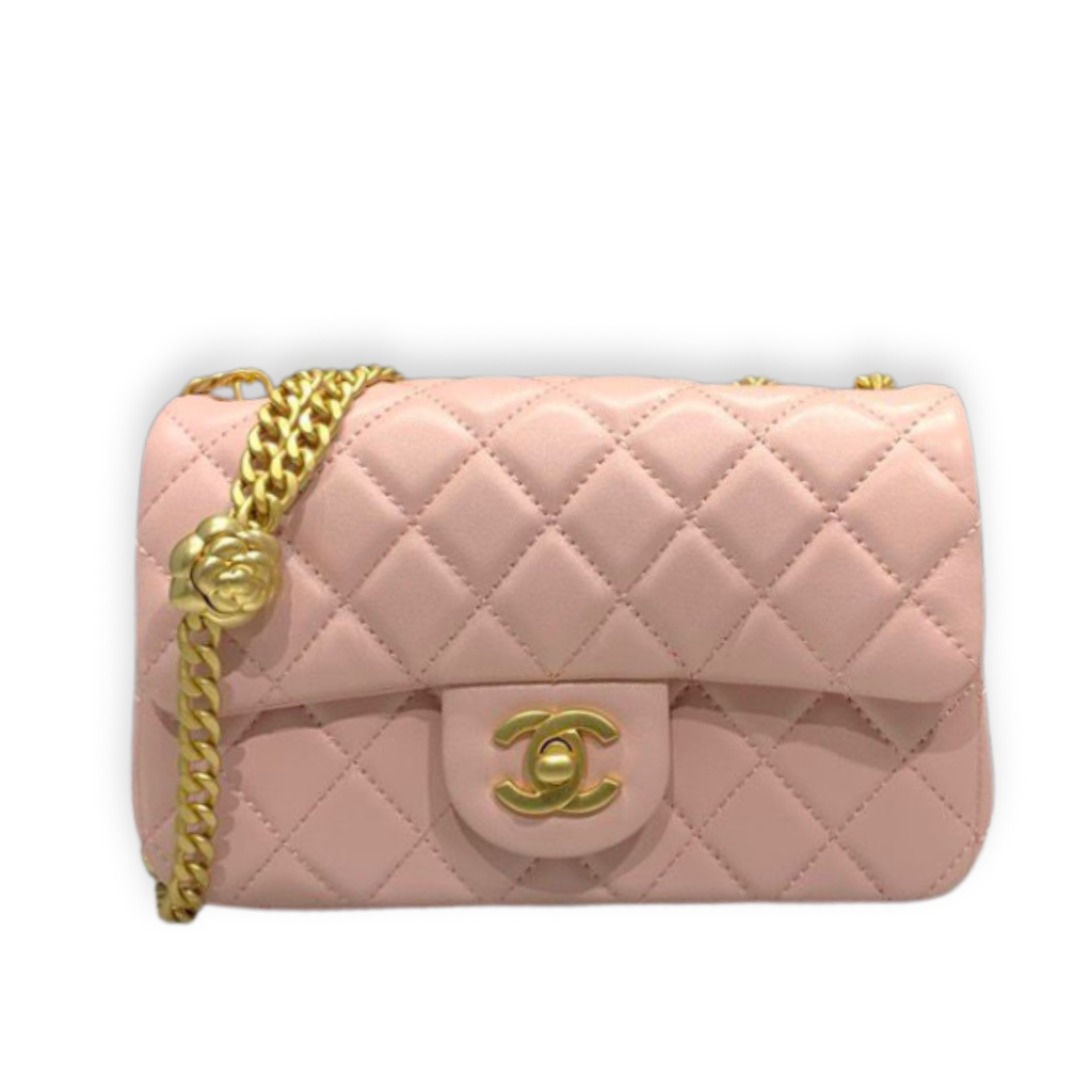 This timeless Chanel Classic Flap is crafted from supple light pink quilted lambskin leather, featuring the iconic diamond quilting and signature interlocking CC turn-lock closure. Finished with a leather-interwoven gold-tone chain strap and a refined front flap silhouette, this elegant piece offers both shoulder and crossbody wear with enduring sophistication.
