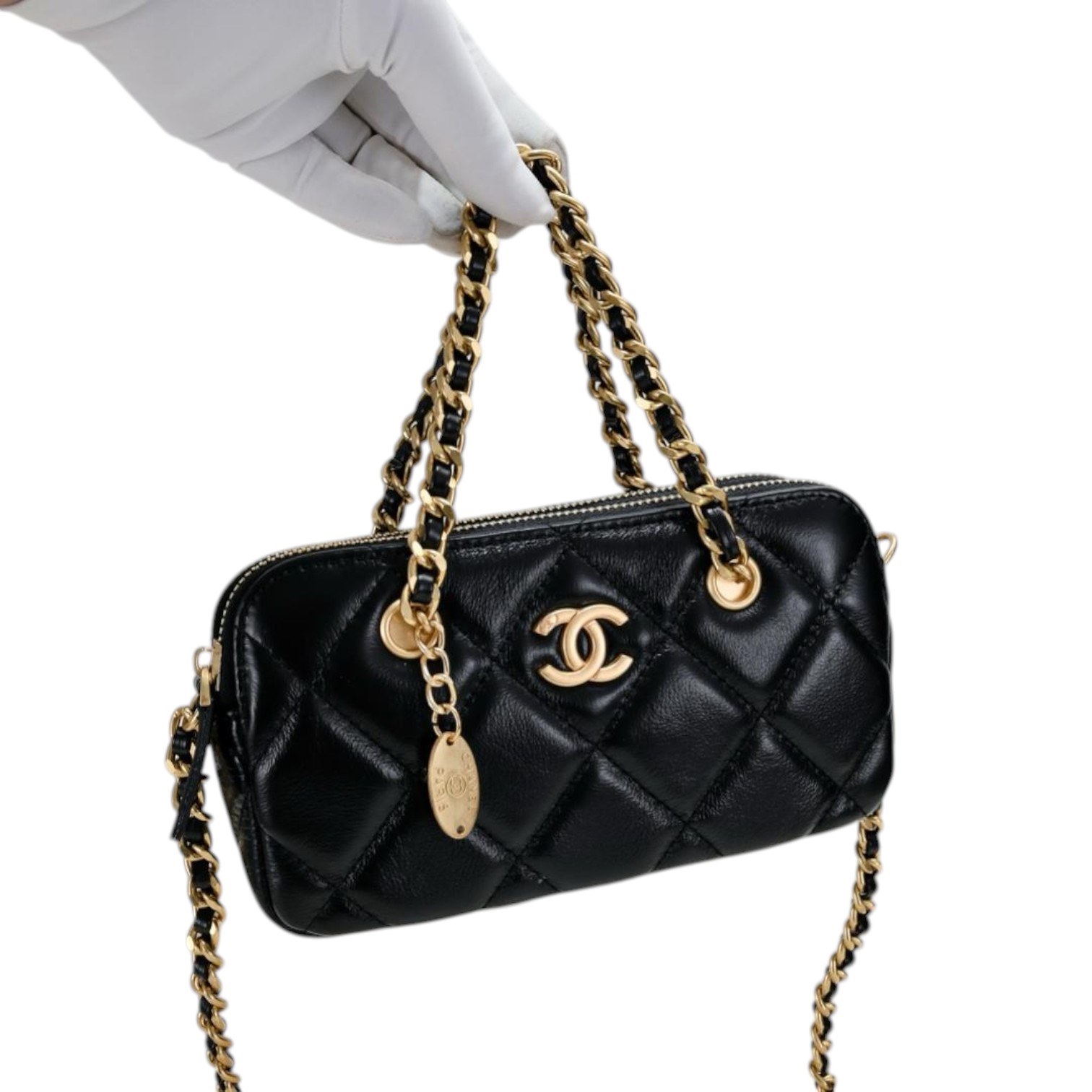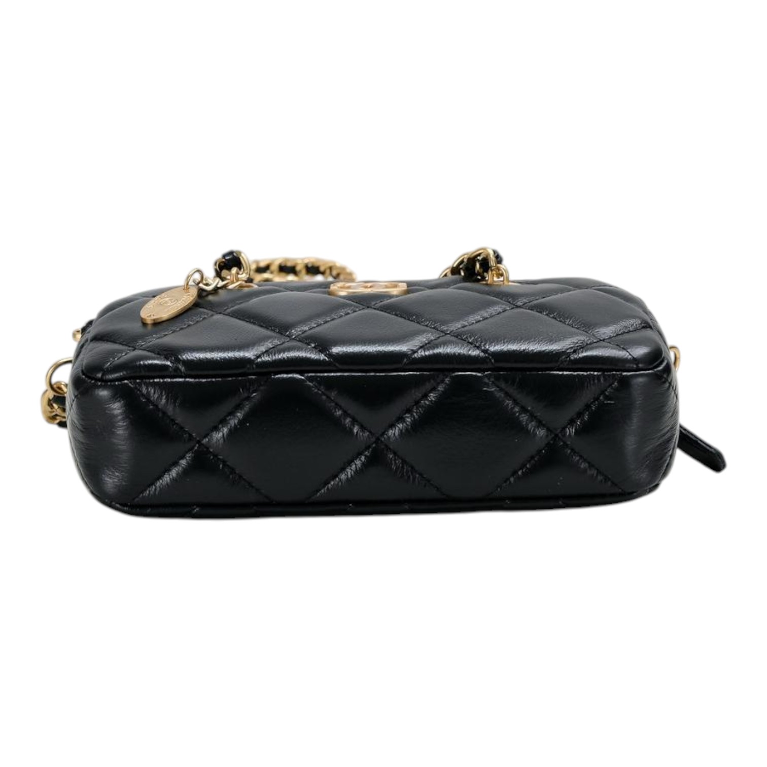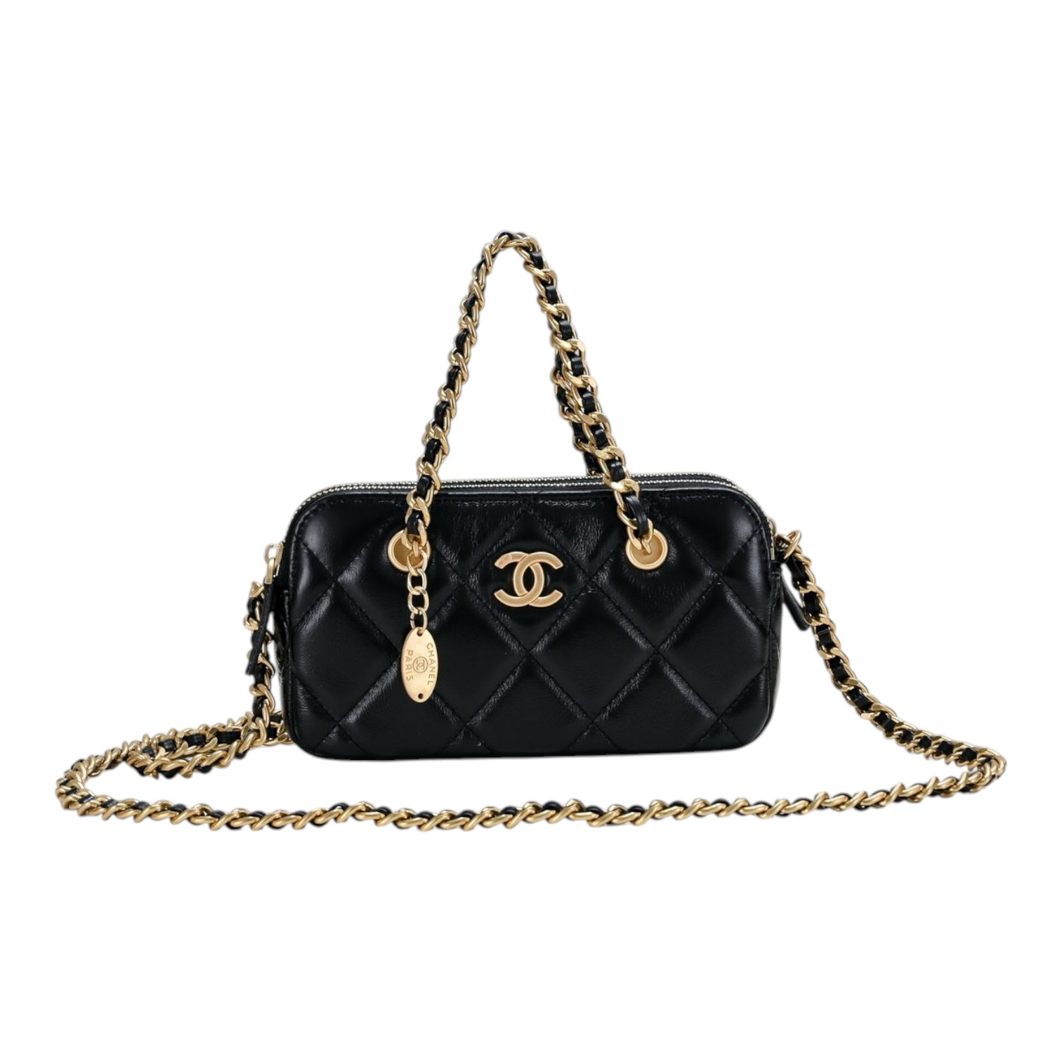 This elegant Chanel camera bag is crafted from supple black quilted lambskin leather, accented with the signature interlocking CC logo at the front. Designed with a structured rectangular silhouette, zip-around closure, leather-interwoven gold-tone chain strap, and matching chain top handle, this refined piece offers versatile shoulder, crossbody, or hand carry with timeless Chanel sophistication.