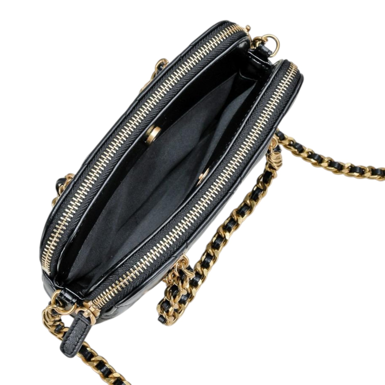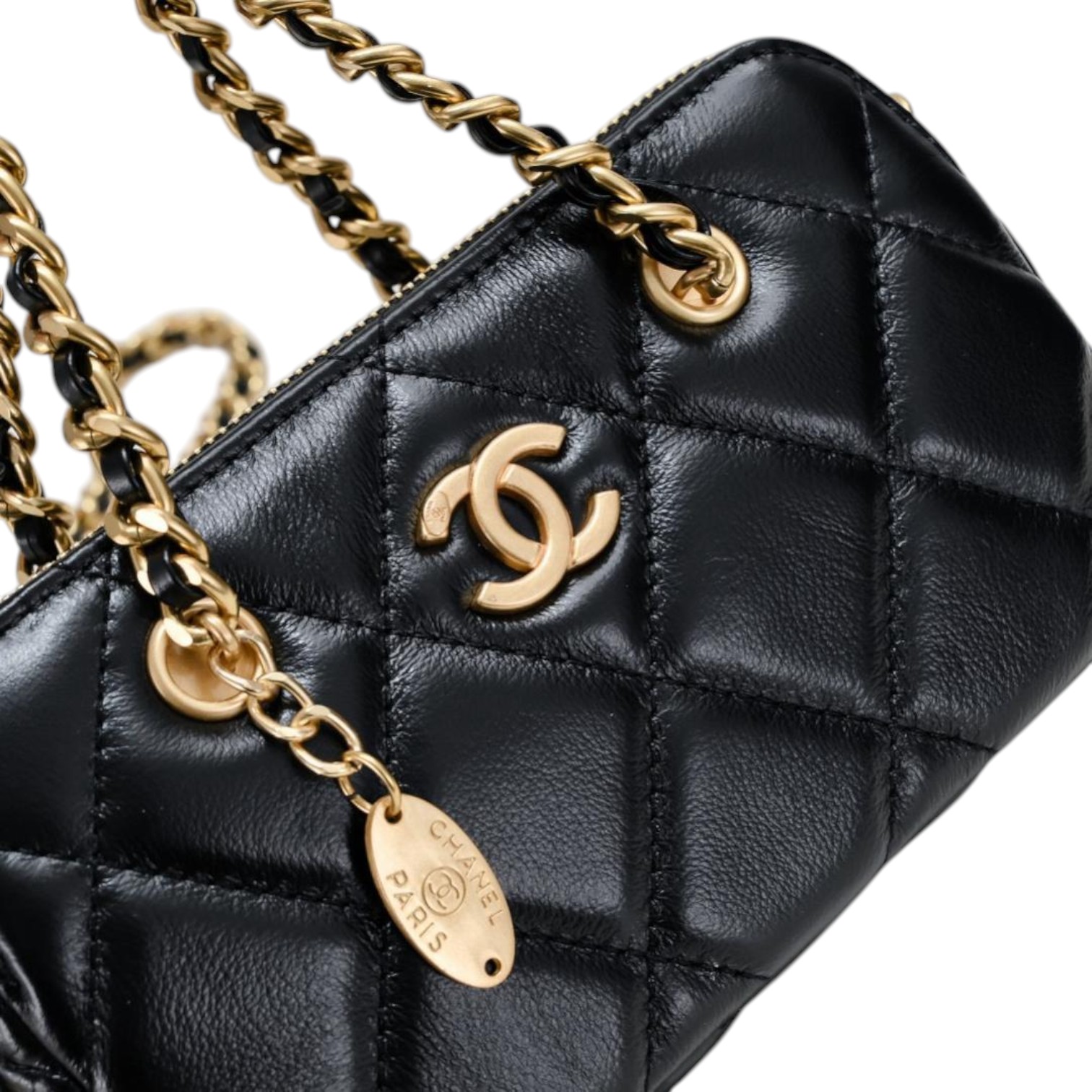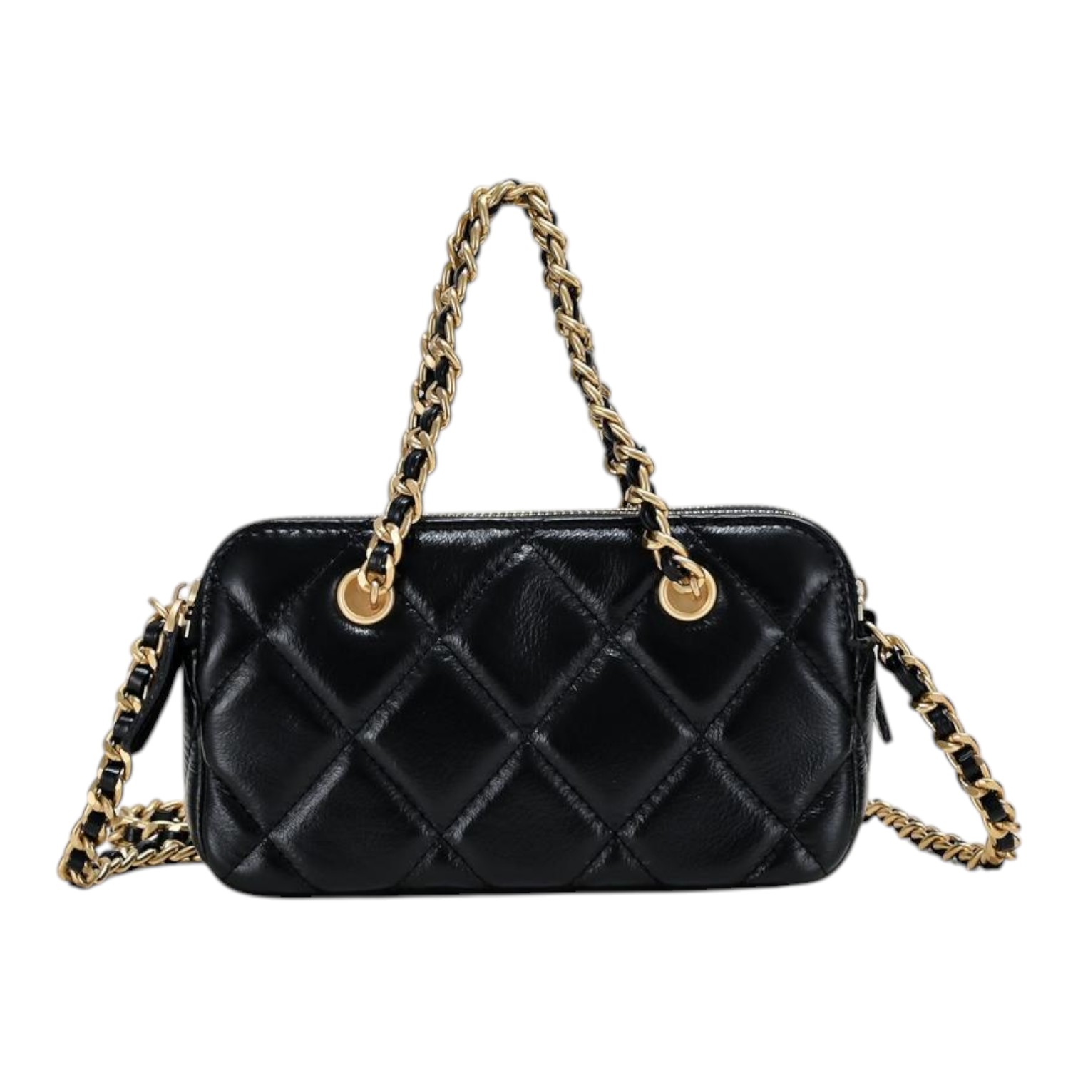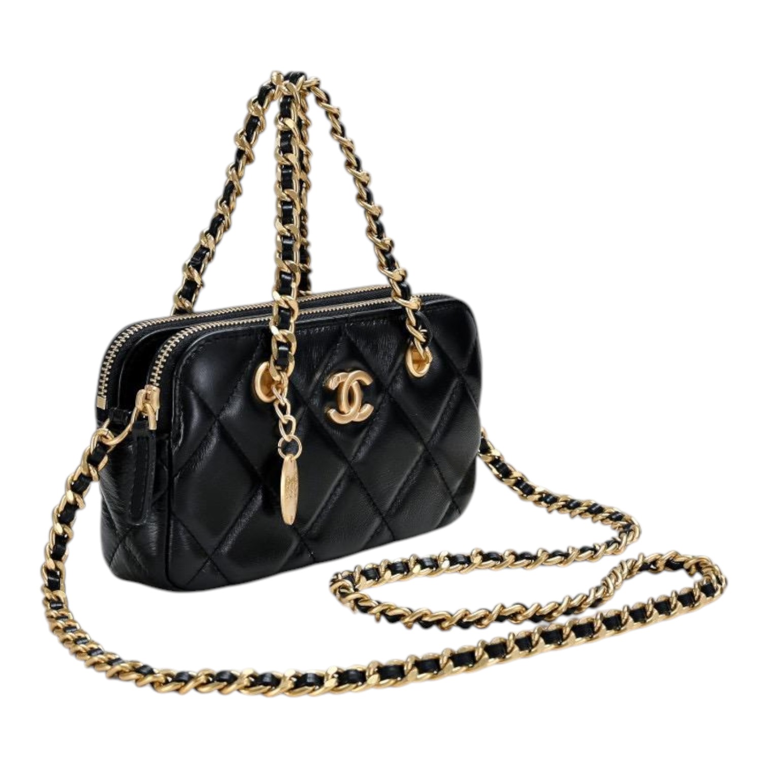 This elegant Chanel camera bag is crafted from supple black quilted lambskin leather, accented with the signature interlocking CC logo at the front. Designed with a structured rectangular silhouette, zip-around closure, leather-interwoven gold-tone chain strap, and matching chain top handle, this refined piece offers versatile shoulder, crossbody, or hand carry with timeless Chanel sophistication.