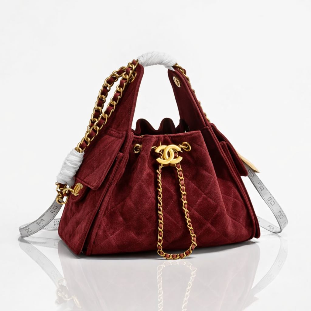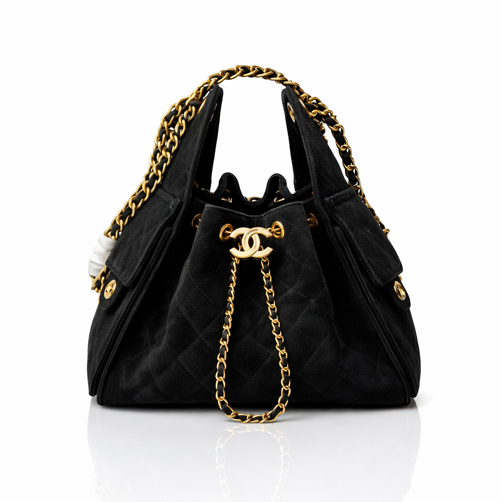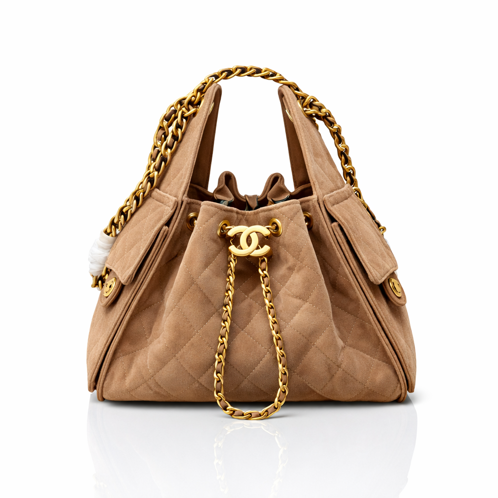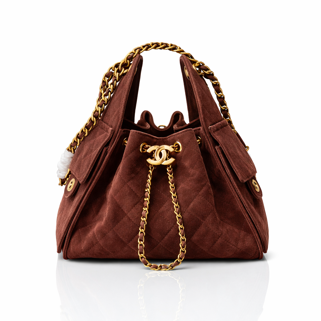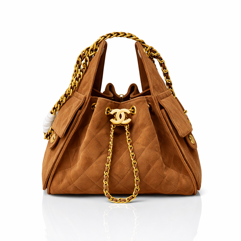 This iconic Chanel bucket bag is crafted from luxurious quilted suede and finished with signature gold-tone hardware. Featuring the classic interlocking CC drawstring closure and chunky chain-and-leather shoulder straps, this design blends vintage elegance with effortless everyday wear. The spacious interior and soft structure make it a timeless and functional statement piece.
