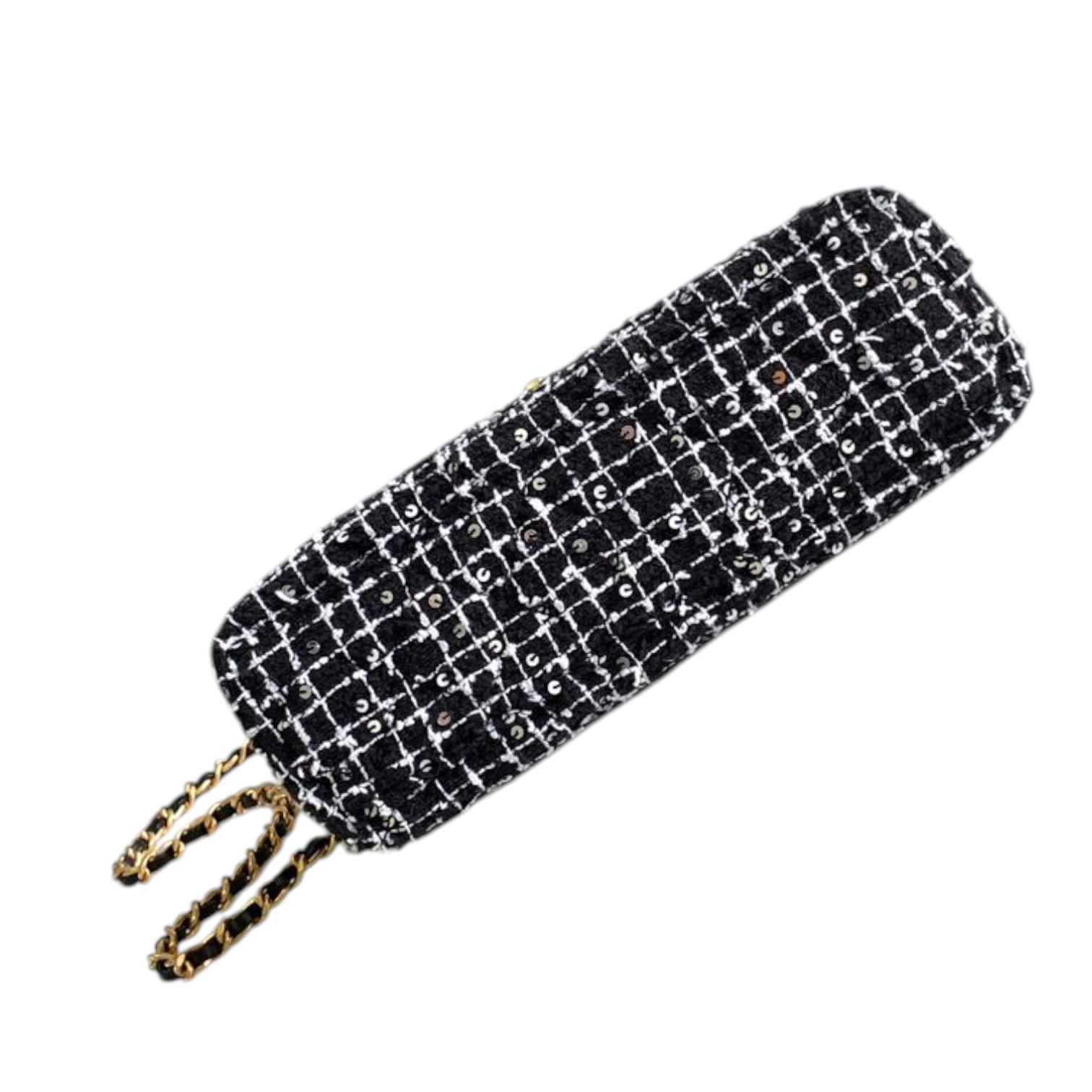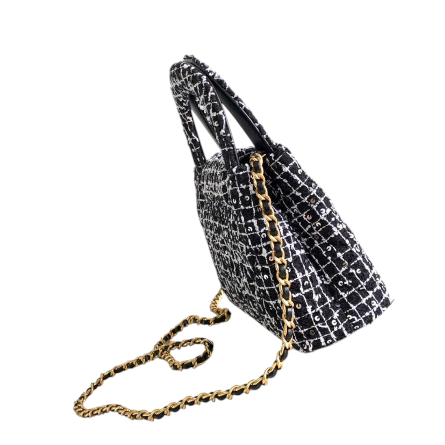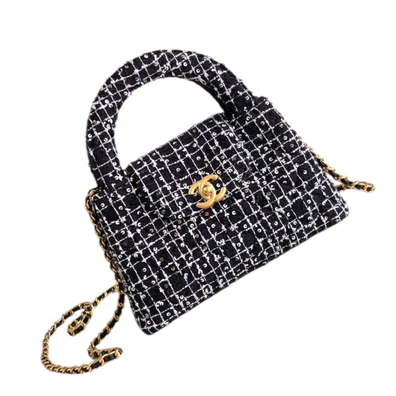 This chic Chanel mini top handle bag is crafted from luxurious black and white tweed fabric, enhanced with sparkling sequin details for a refined touch. The bag features the iconic interlocking CC logo in gold-tone hardware, a structured silhouette, and a chain strap for versatile crossbody or shoulder wear. The combination of the iconic tweed design and elegant hardware reflects Chanel’s timeless elegance.