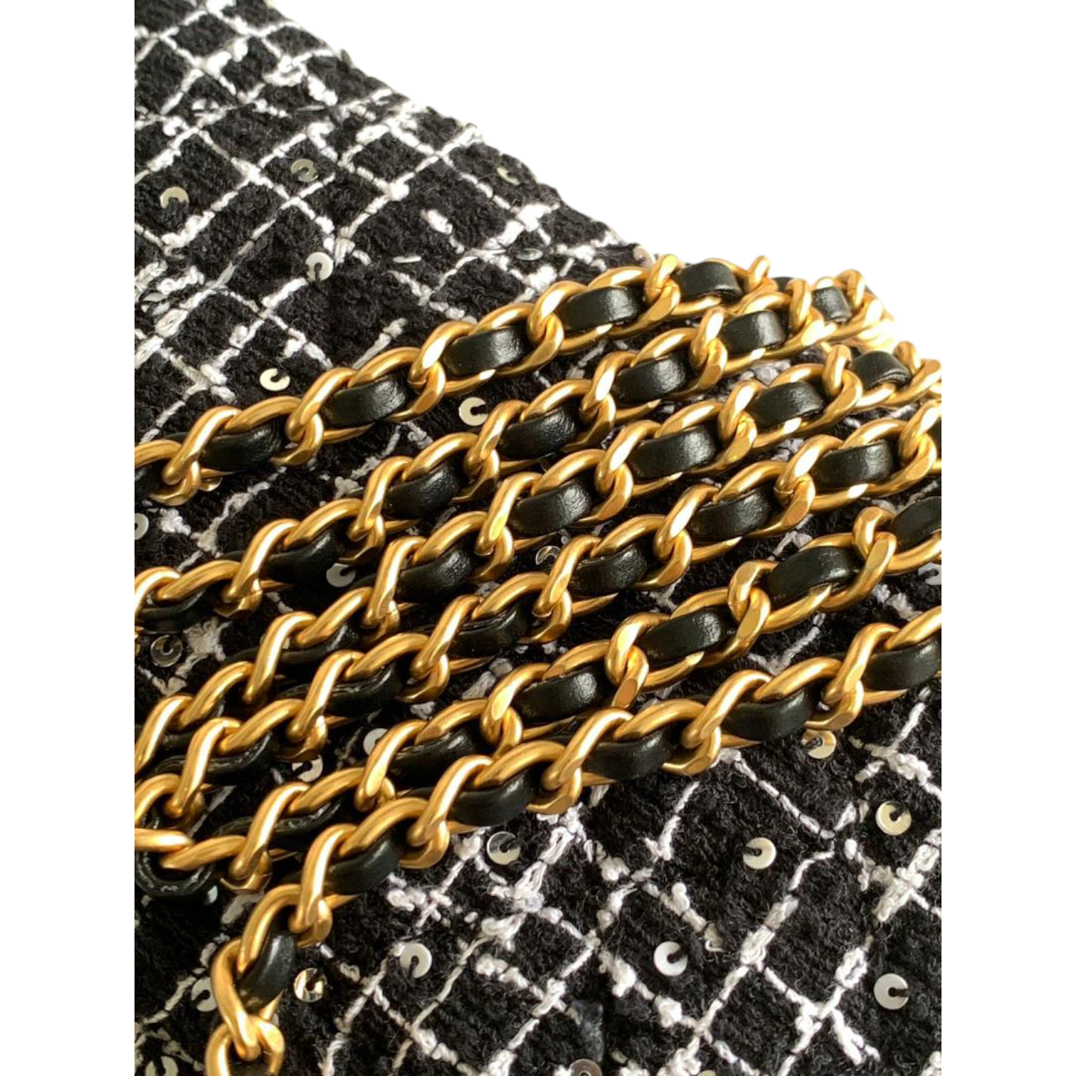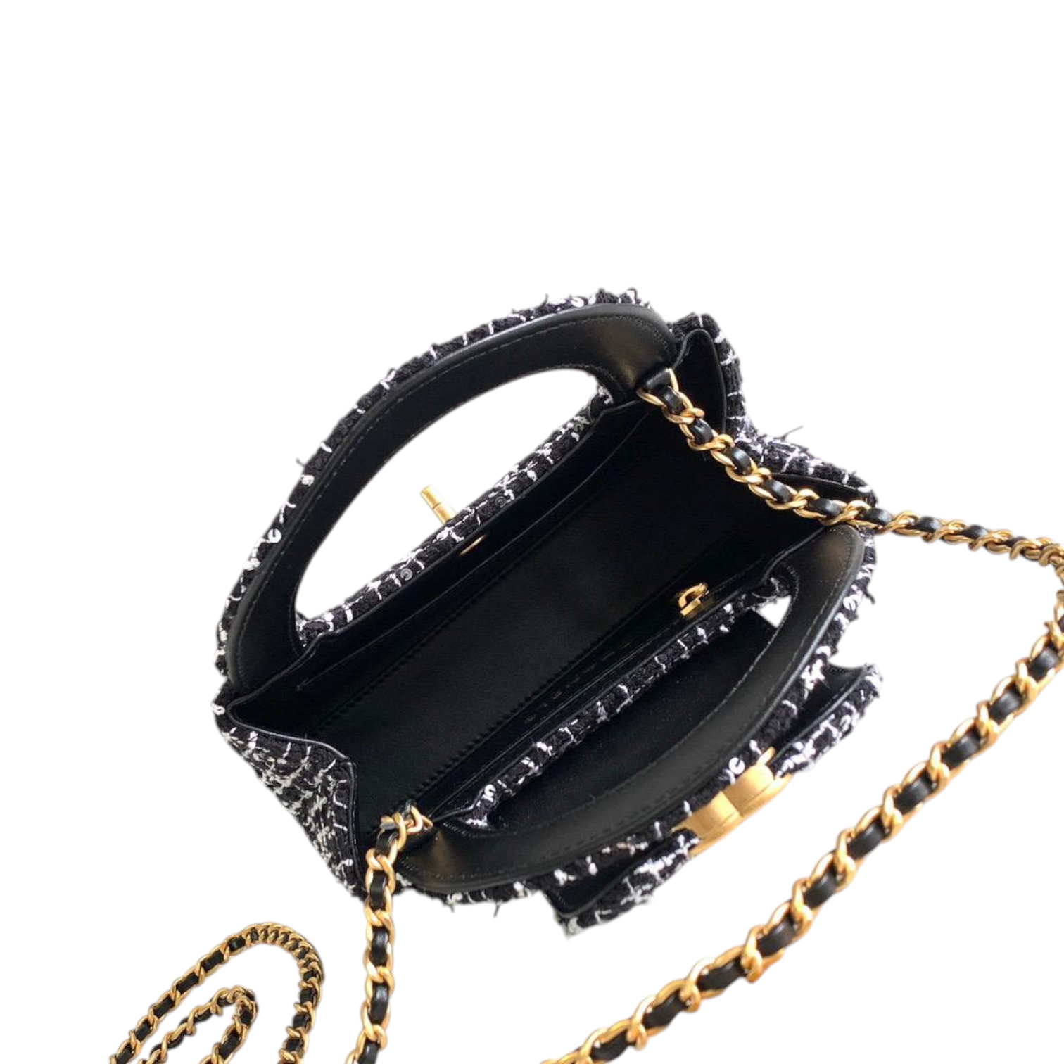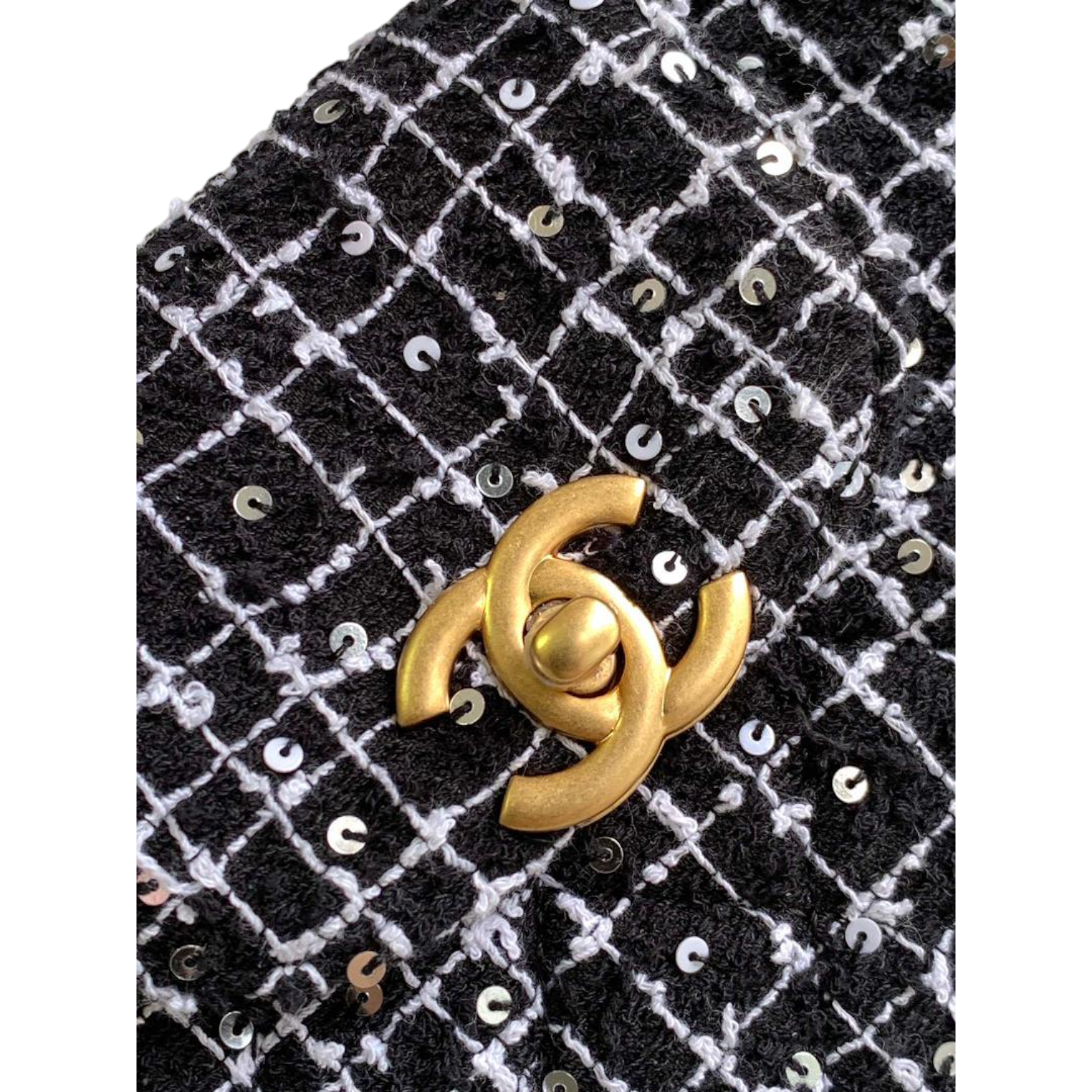 This chic Chanel mini top handle bag is crafted from luxurious black and white tweed fabric, enhanced with sparkling sequin details for a refined touch. The bag features the iconic interlocking CC logo in gold-tone hardware, a structured silhouette, and a chain strap for versatile crossbody or shoulder wear. The combination of the iconic tweed design and elegant hardware reflects Chanel’s timeless elegance.