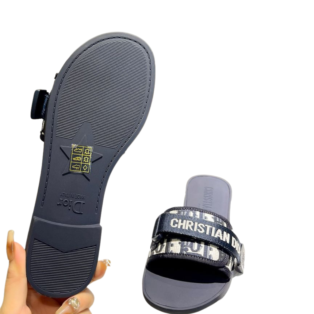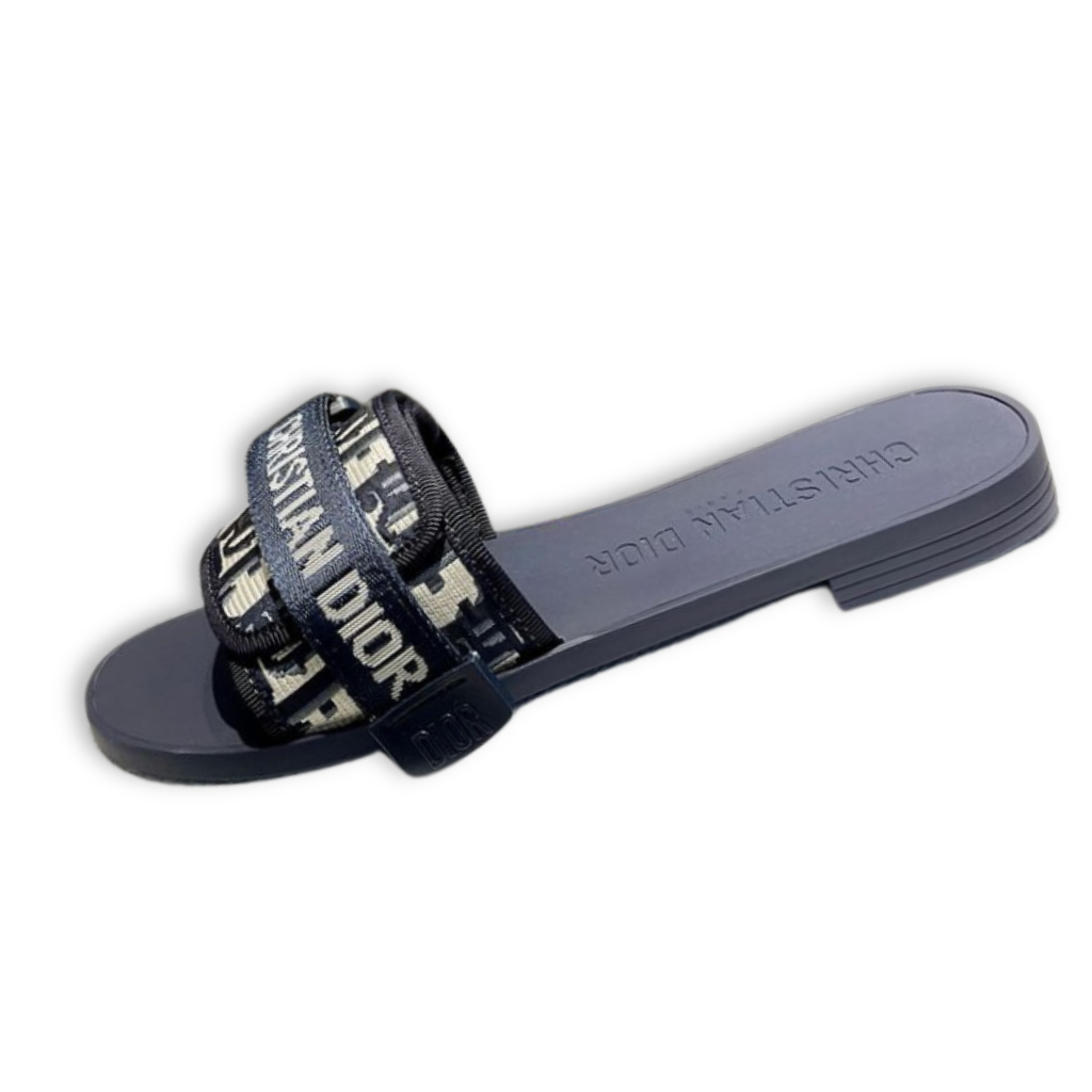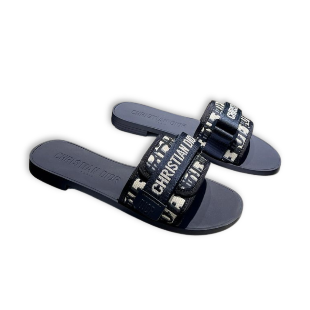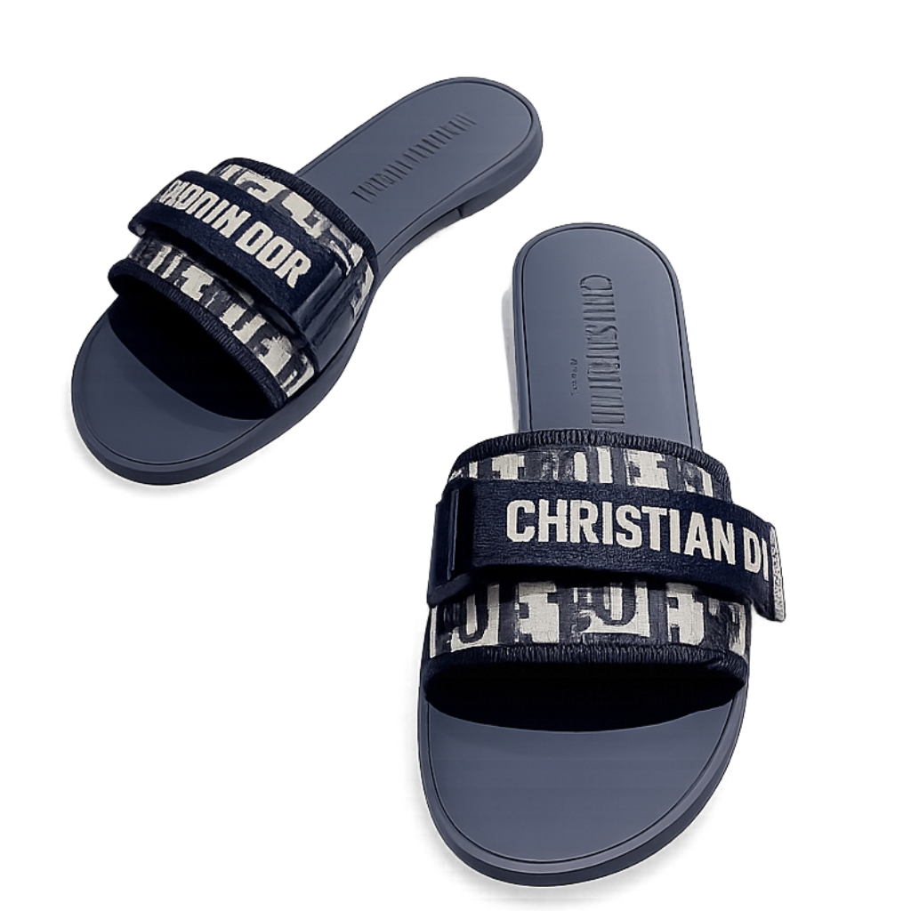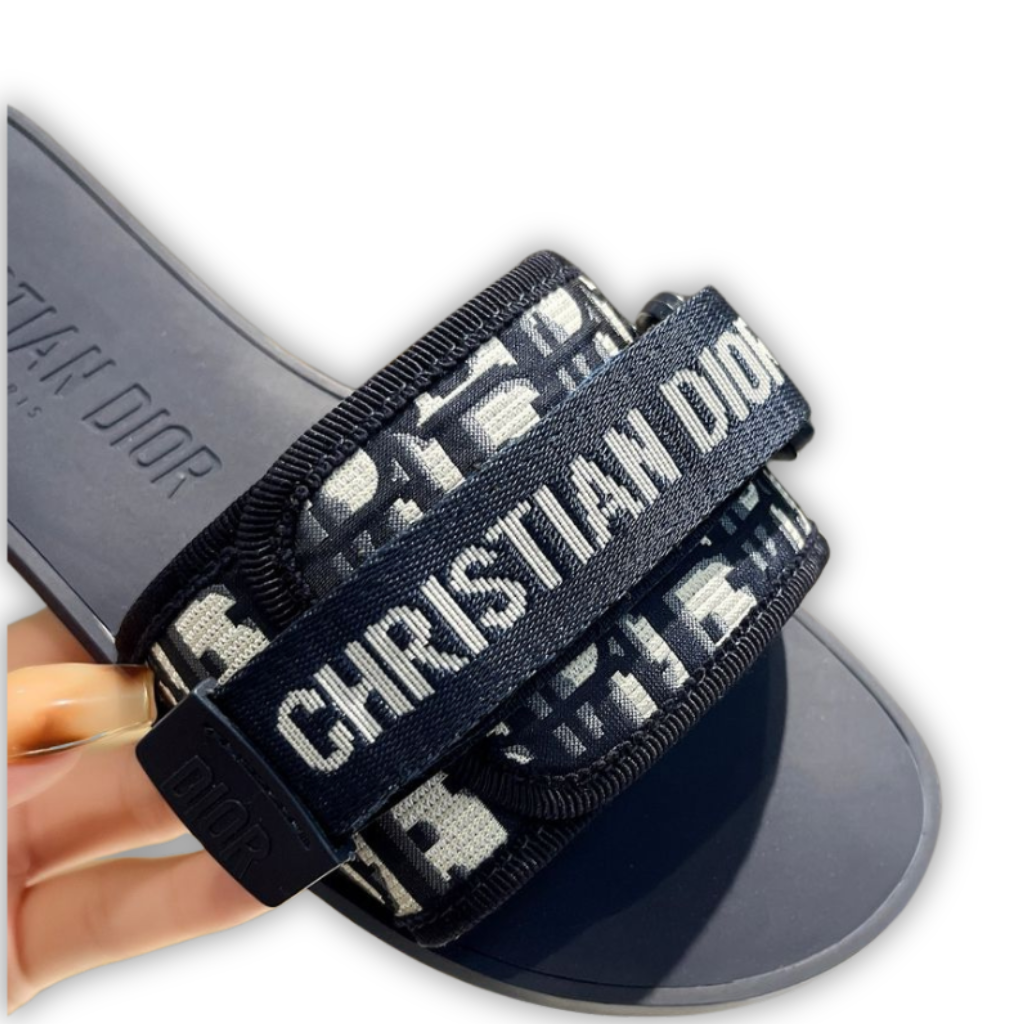 These iconic Dway slide sandals are crafted from Dior’s signature navy blue Oblique jacquard textile, featuring a wide embroidered upper strap prominently accented with the “CHRISTIAN DIOR” logo. Designed with an easy slip-on silhouette and a contoured rubber footbed, this style delivers effortless comfort while maintaining a distinctly recognizable luxury aesthetic.