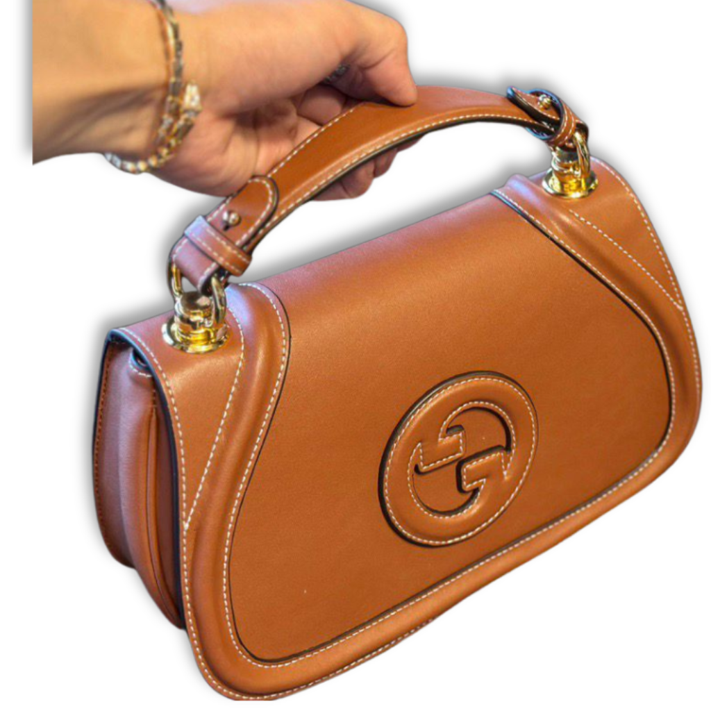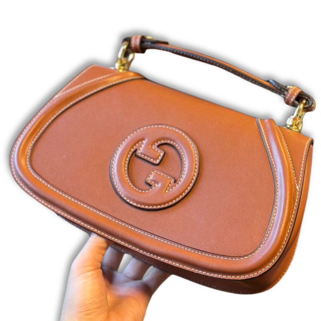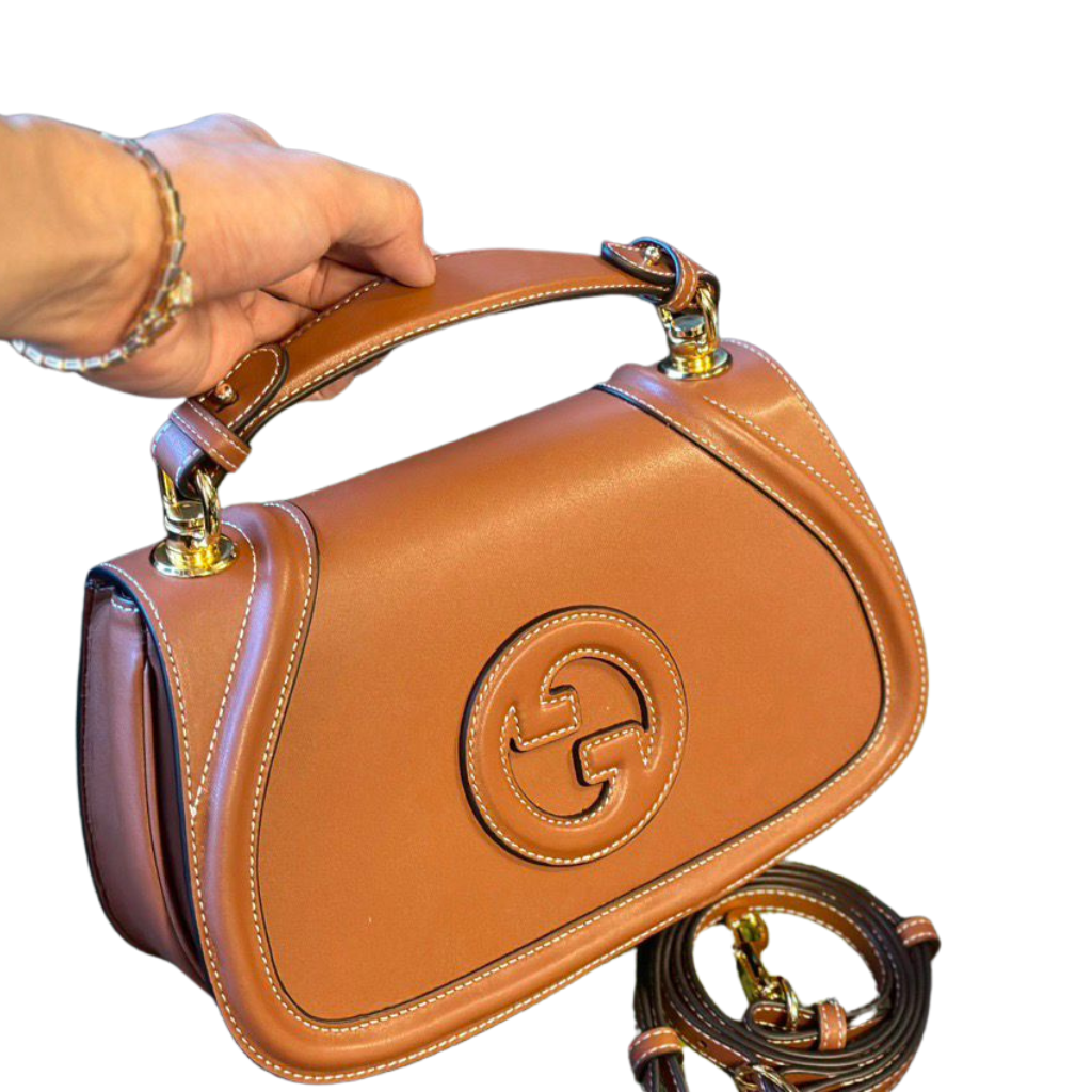 This refined Gucci Blondie small shoulder bag is crafted from smooth brown leather, highlighted by the signature embossed interlocking GG logo centered on the front flap. Featuring a structured silhouette, elegant contrast stitching, gold-tone hardware, and a leather top handle with an optional shoulder strap, this timeless piece offers versatile carry with classic Gucci heritage appeal.