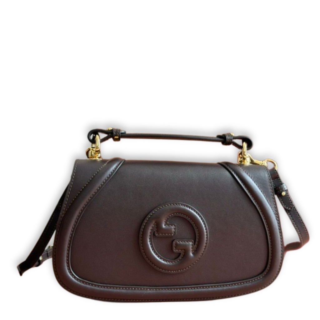 This elegant Gucci Blondie shoulder bag is crafted from smooth brown leather, showcasing the signature embossed interlocking GG logo centered on the front flap. Designed with a structured silhouette, gold-tone hardware, a slim leather top handle, and an adjustable shoulder strap, this refined piece offers versatile carry with timeless house branding and understated sophistication.