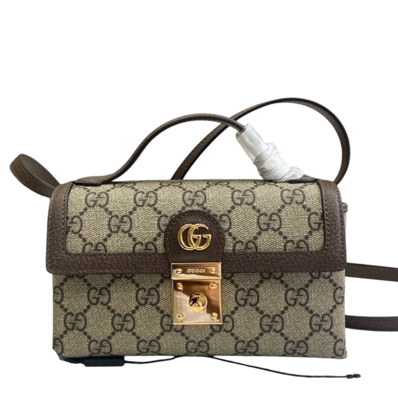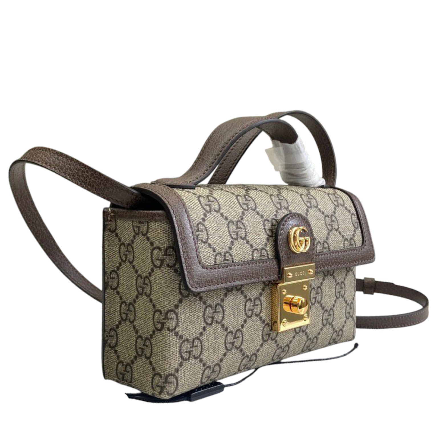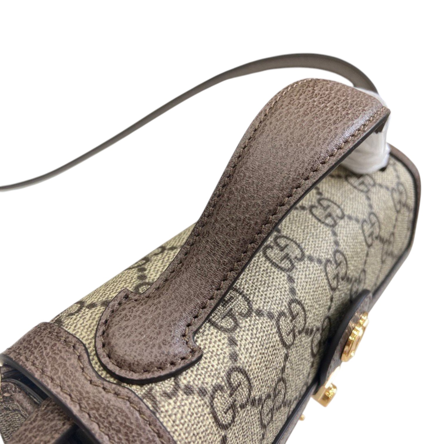 This Gucci Ophidia Mini Top Handle Bag presents an elegant interpretation of the Maison’s heritage with iconic GG Supreme canvas in beige and ebony, beautifully contrasted by rich brown leather trim and light gold-tone Double G hardware. The structured top handle silhouette features a refined lock closure and compact proportions that perfectly suit everyday essentials such as an iPhone, small wallet, AirPods, and lipstick. Meticulously finished with a viscose and microfiber lining with a suede-like feel and adjustable leather strap, this mini piece harmonizes classic Gucci motifs with modern mini-bag utility.