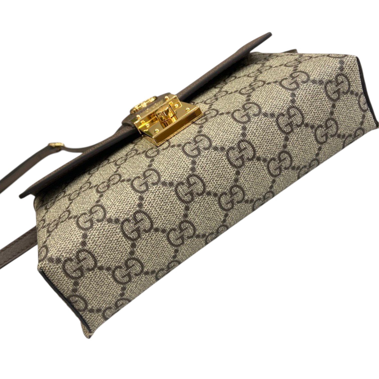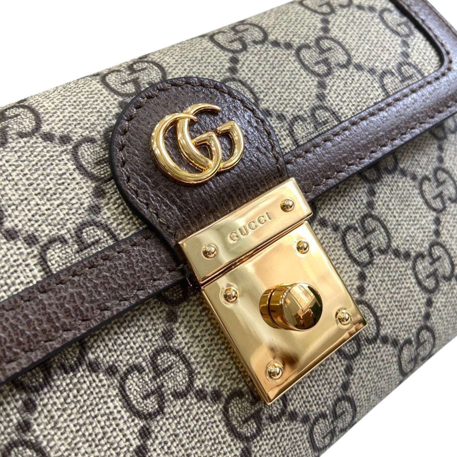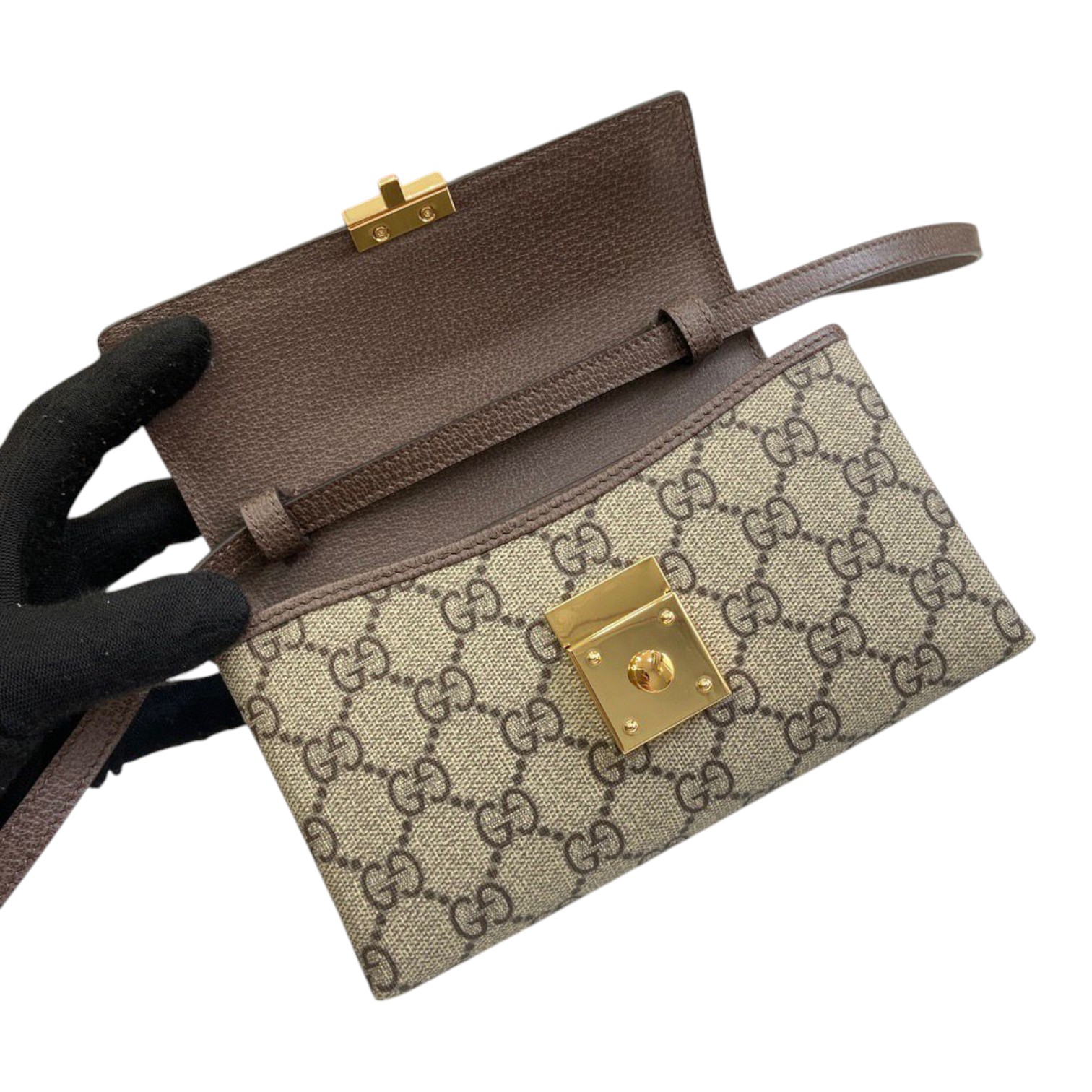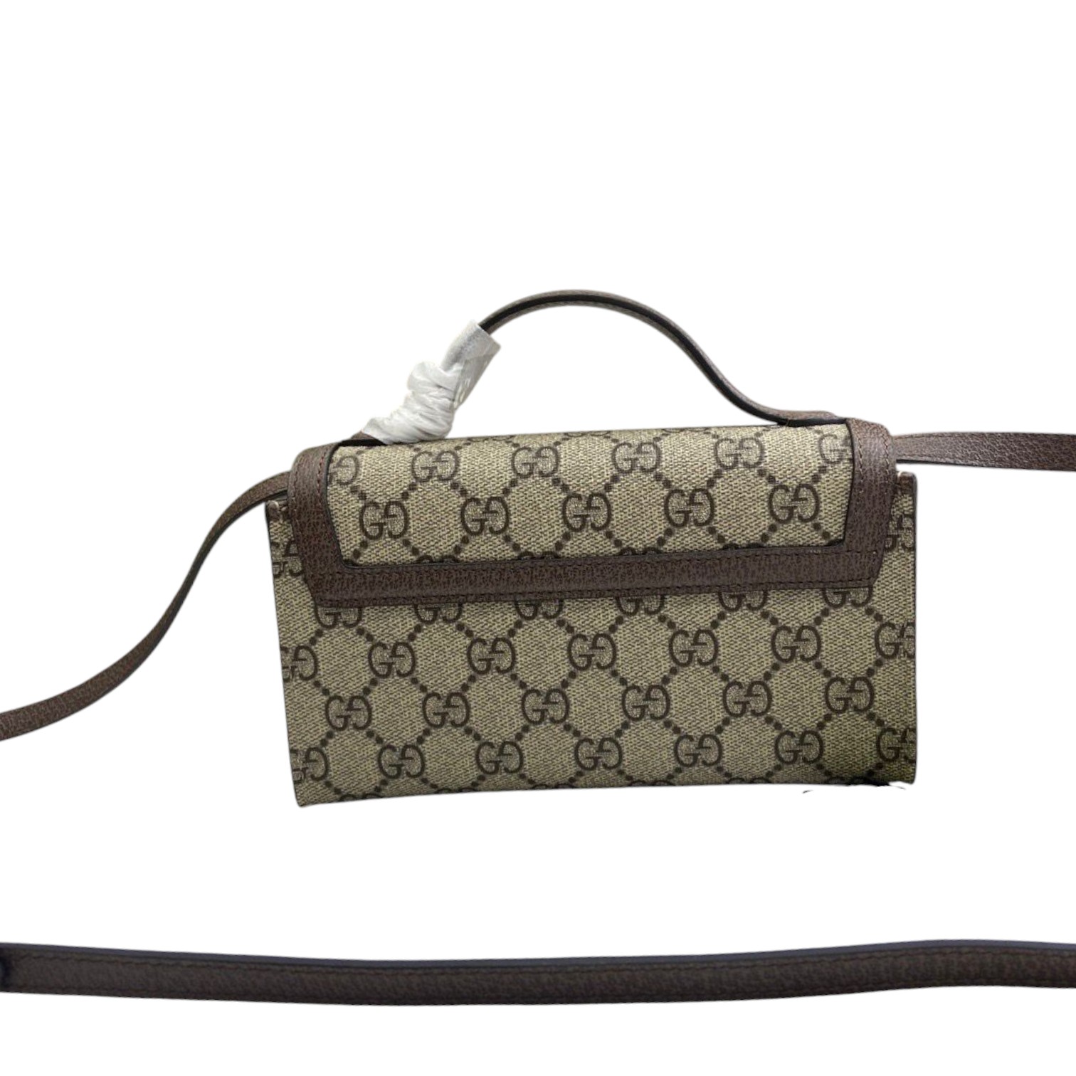 This Gucci Ophidia Mini Top Handle Bag presents an elegant interpretation of the Maison’s heritage with iconic GG Supreme canvas in beige and ebony, beautifully contrasted by rich brown leather trim and light gold-tone Double G hardware. The structured top handle silhouette features a refined lock closure and compact proportions that perfectly suit everyday essentials such as an iPhone, small wallet, AirPods, and lipstick. Meticulously finished with a viscose and microfiber lining with a suede-like feel and adjustable leather strap, this mini piece harmonizes classic Gucci motifs with modern mini-bag utility.