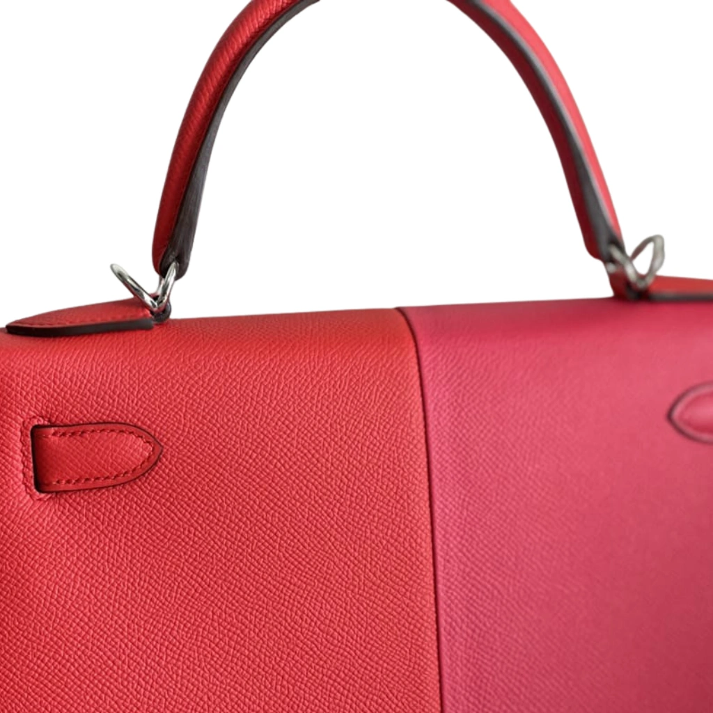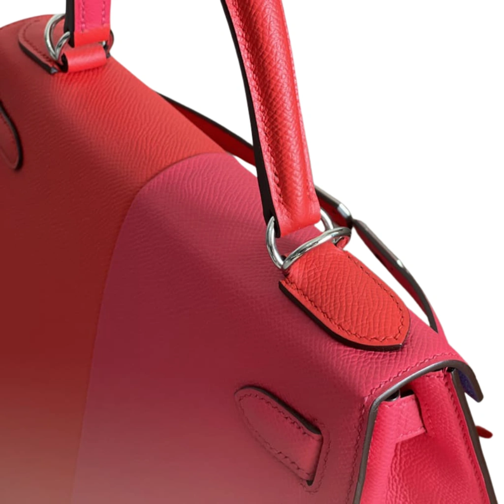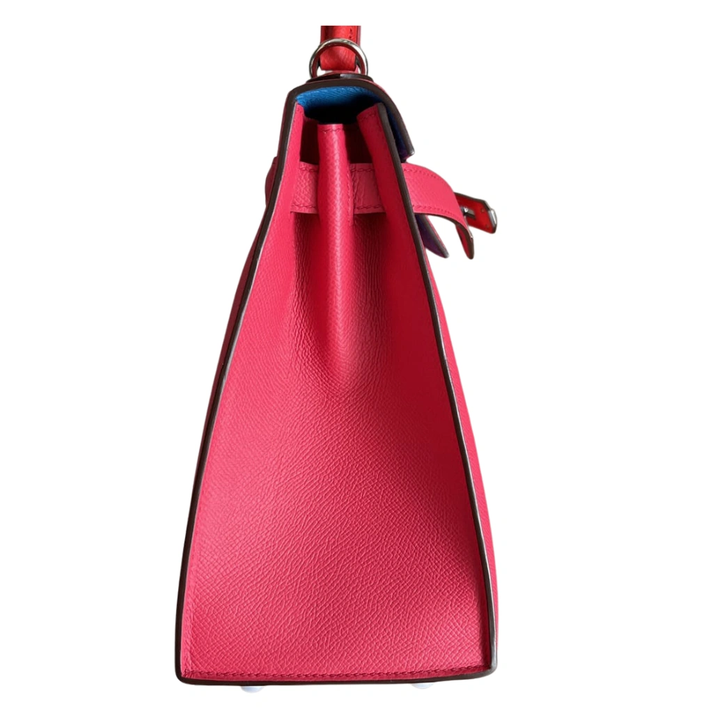 This striking Hermès Kelly 28 Sellier handbag is meticulously crafted in France from durable Epsom leather, featuring an exquisite tri-color combination of vibrant Rose Extrême and Rouge de Cœur with contrasting Blue Zanzibar accents. The structured Sellier construction showcases crisp edges and a refined silhouette, complemented by the iconic top handle, sangles, and signature Kelly turn-lock closure finished in sleek palladium hardware. Bold yet timeless, this exceptional handbag is a true collector’s piece, offering elevated elegance and versatile luxury from day to evening.