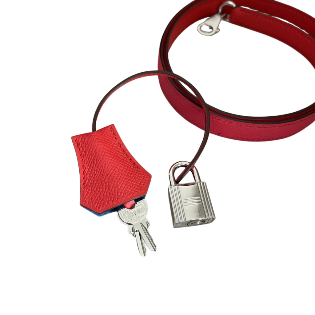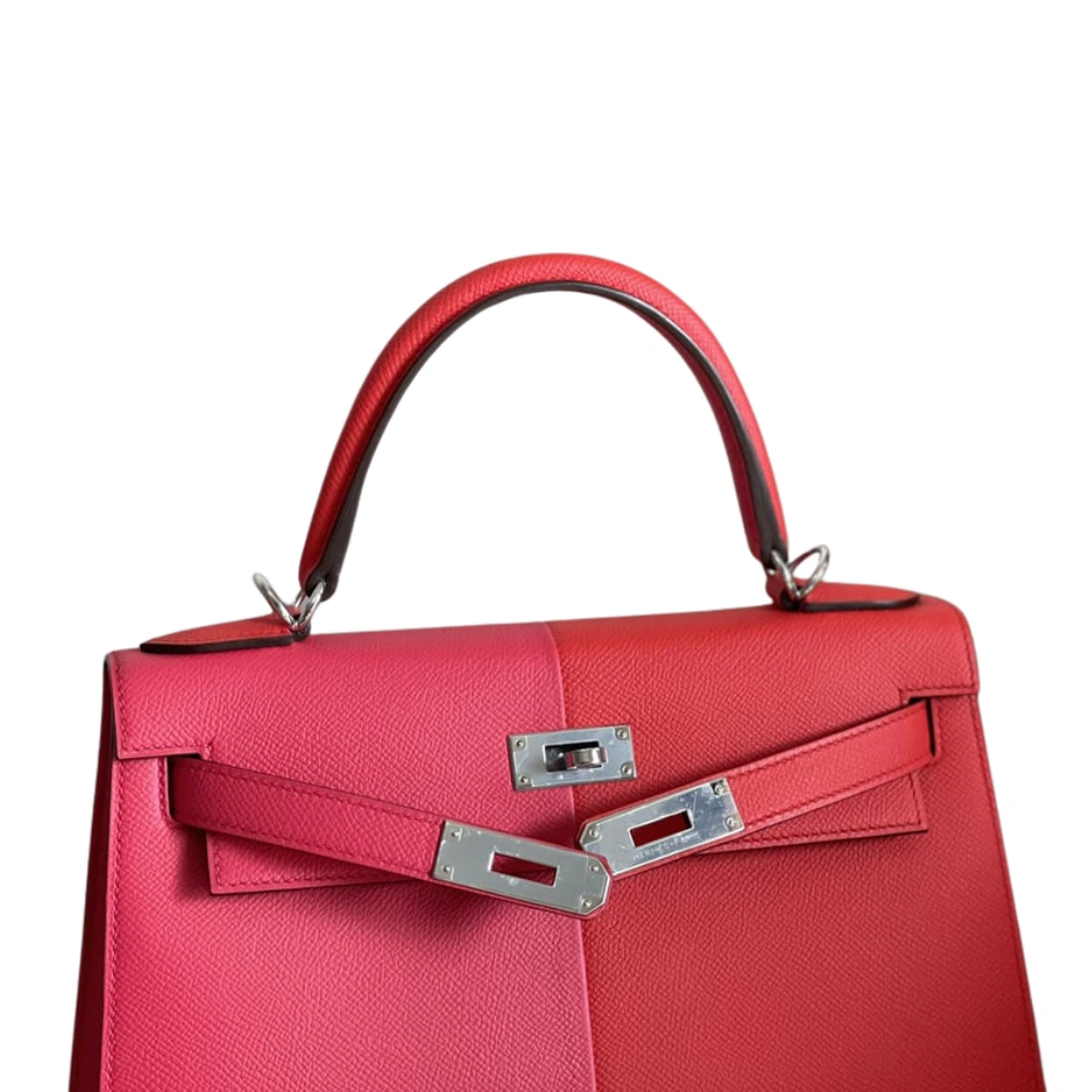 Be the first to review “HERMÈS Kelly 28 Sellier Handbag in Rose Extrême / Rouge de Cœur Epsom Leather with Blue Zanzibar Accents and Palladium Hardware”
