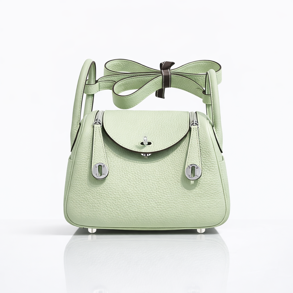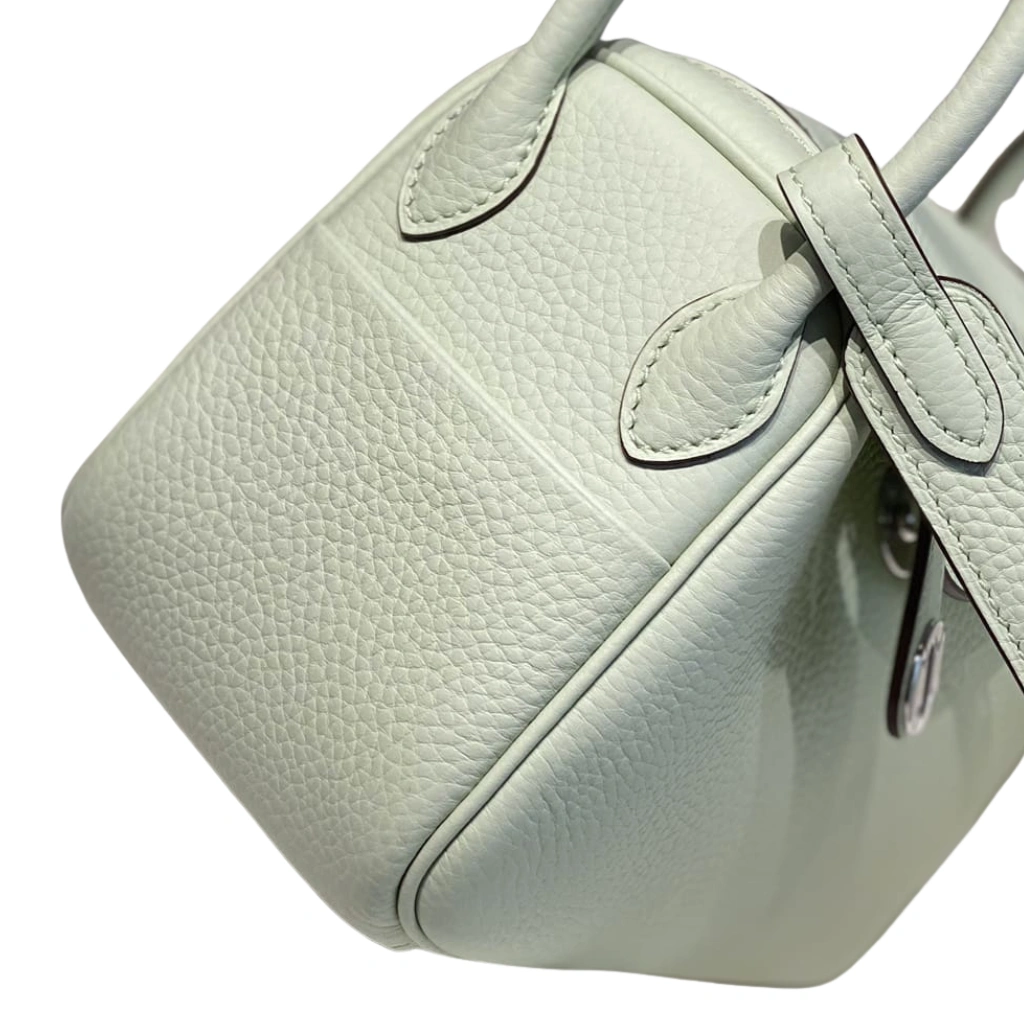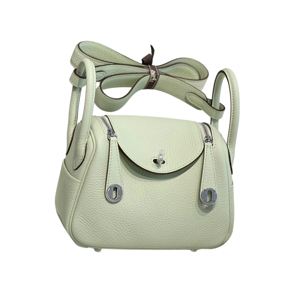 This Hermès Mini Lindy 20 is exquisitely crafted from supple Taurillon Clemence calfskin in the delicate Vert Criquet hue, a sought-after pastel mint green celebrated for its fresh and refined elegance. The softly structured silhouette is complemented by signature twin rolled handles, a removable shoulder strap for versatile wear, and the Lindy’s distinctive dual-zip closure meeting at a central clou de selle turn-lock in polished palladium hardware. Finished with exterior side pockets and a leather-lined interior, this compact yet functional design embodies effortless sophistication and modern Hermès craftsmanship.