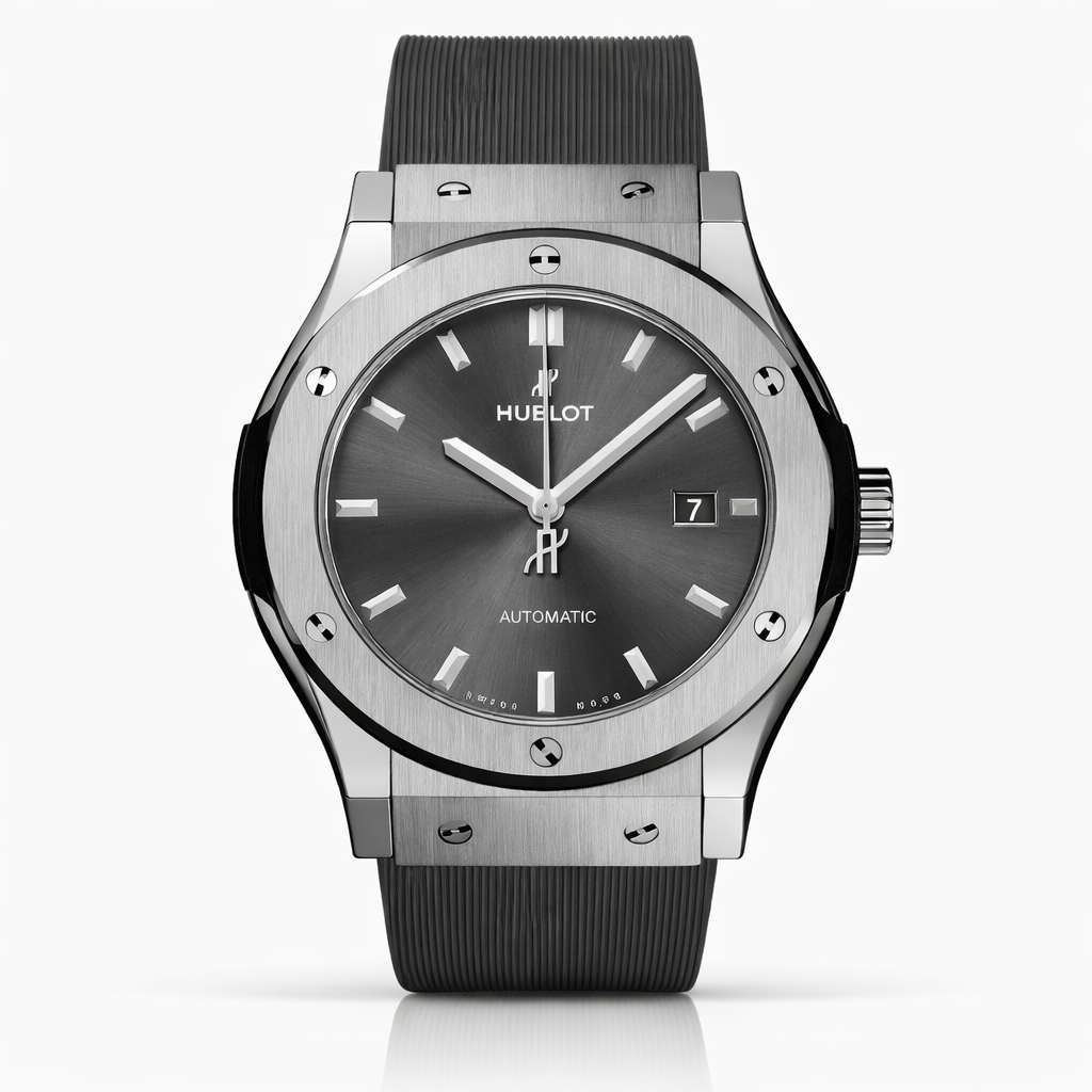 This refined Hublot Classic Fusion timepiece is crafted in lightweight titanium and features a sleek grey sunburst dial accented by applied hour markers and a discreet date window at 3 o’clock. Designed with a minimalist aesthetic, it is powered by an automatic movement and finished with a grey alligator-embossed leather strap, offering understated luxury and everyday versatility emblematic of the Classic Fusion collection.