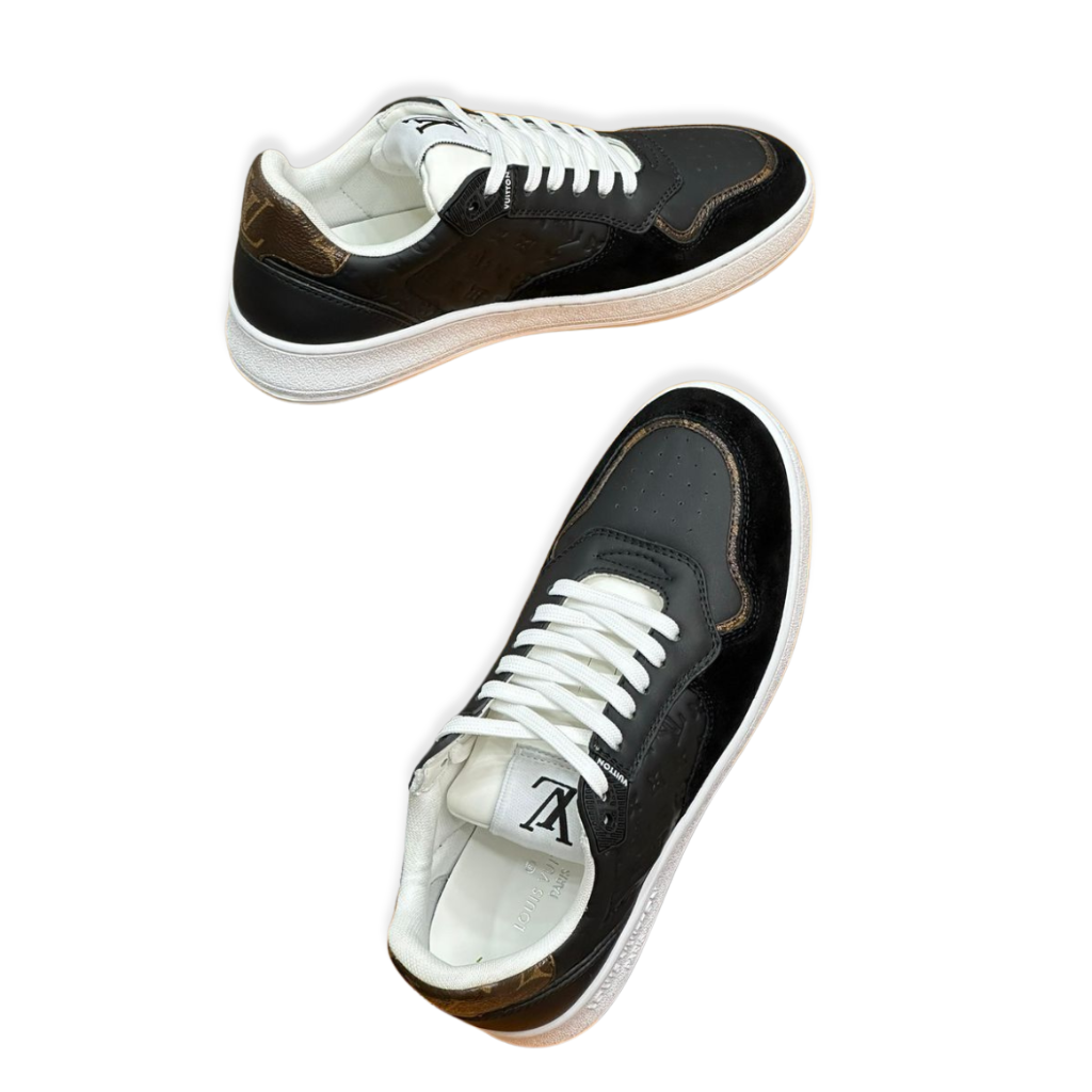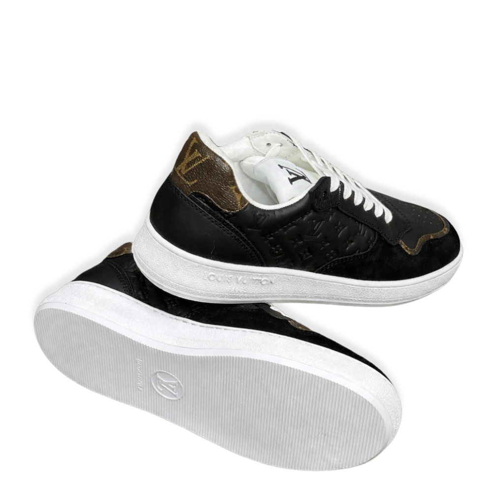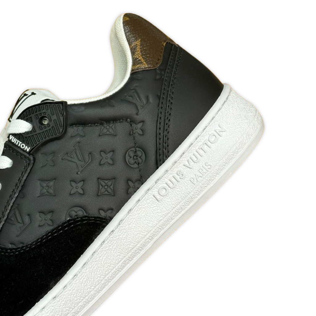 This sleek low-top sneaker is crafted from smooth black calf leather, featuring the iconic Louis Vuitton Monogram embossed along the side panels for a subtle signature finish. Designed with classic lace-up closure, a padded tongue stamped with the LV logo, and a contrasting white rubber sole, this style offers a refined yet versatile silhouette ideal for everyday luxury wear.
