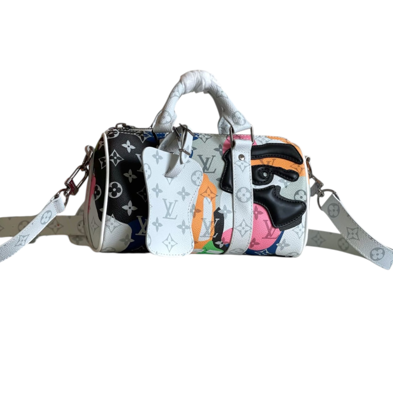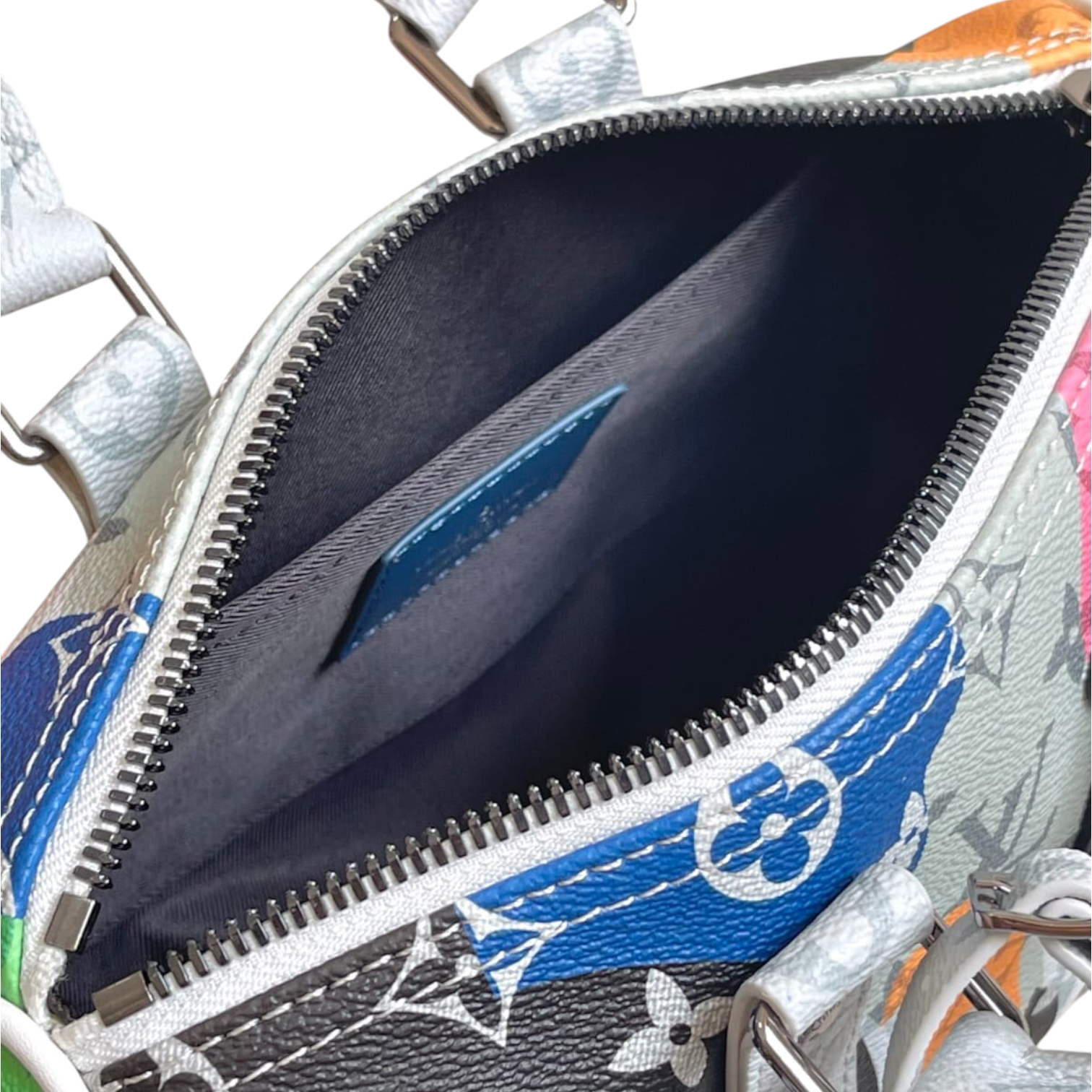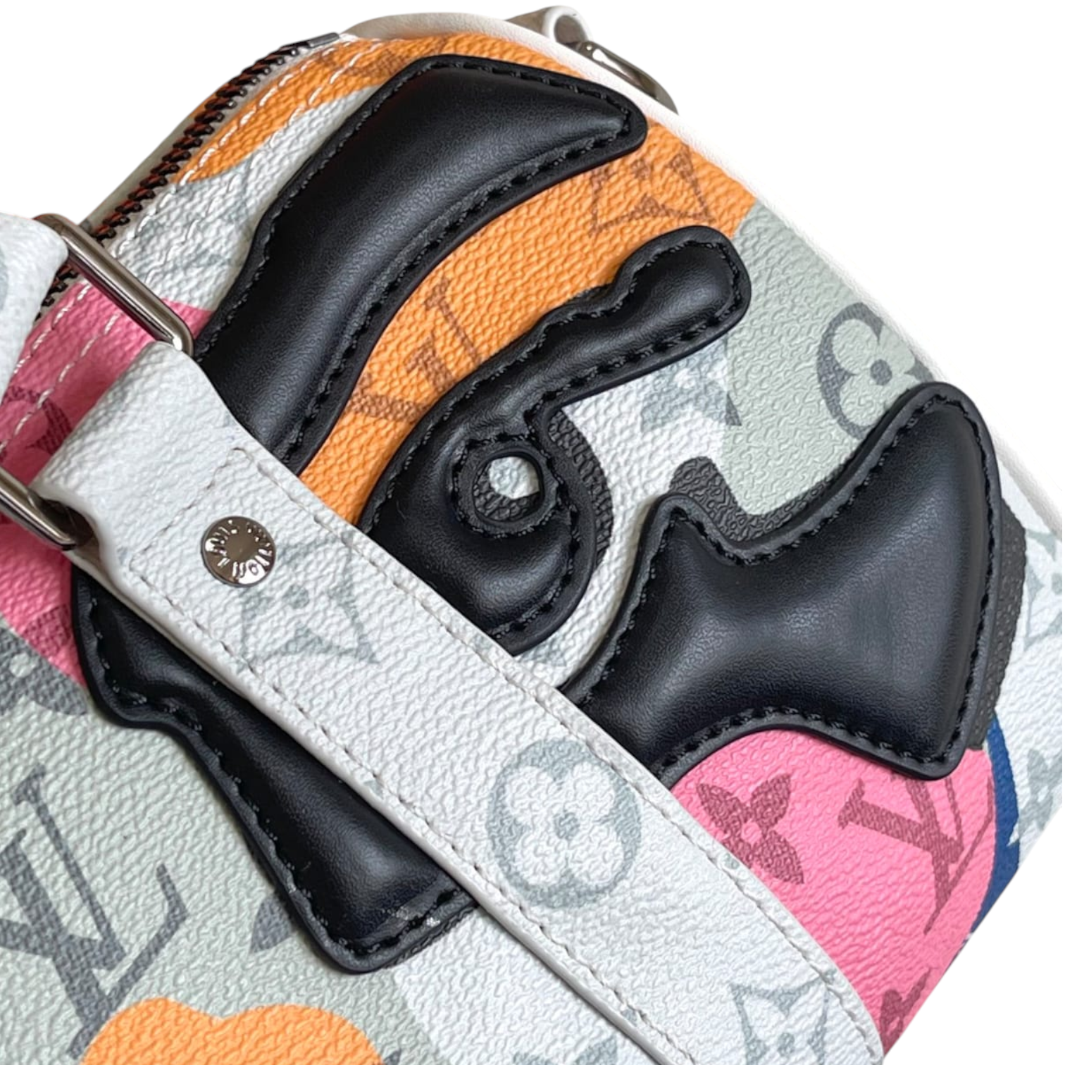 This striking Louis Vuitton Speedy Bandoulière 20 showcases a bold multicolor pop-art interpretation of the iconic Monogram canvas. Featuring vibrant graphic elements layered over classic LV motifs, this statement piece blends contemporary artistry with the house’s timeless silhouette. Finished with matching monogram handles, a detachable adjustable shoulder strap, and polished silver-tone hardware, this bag is both collectible and fashion-forward.