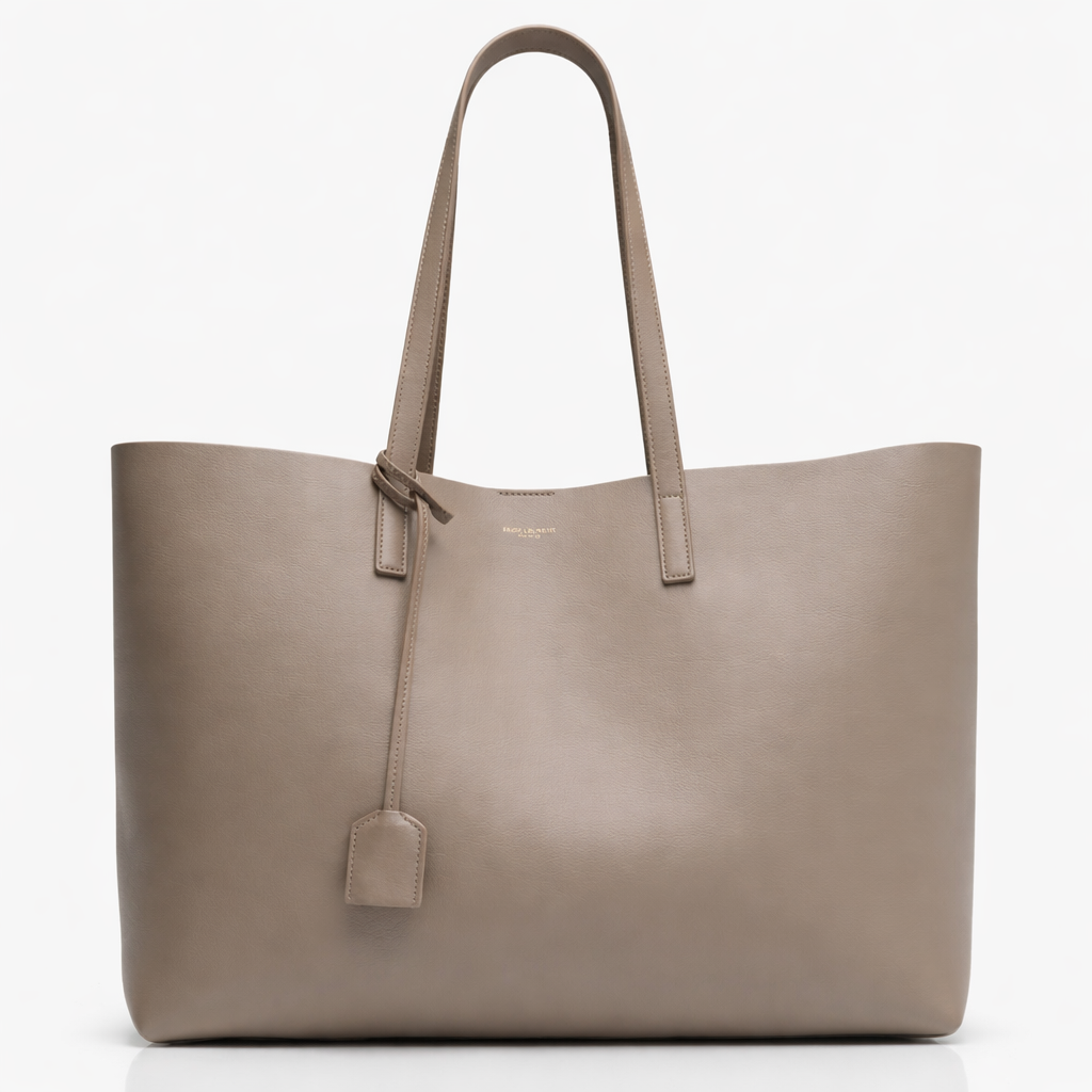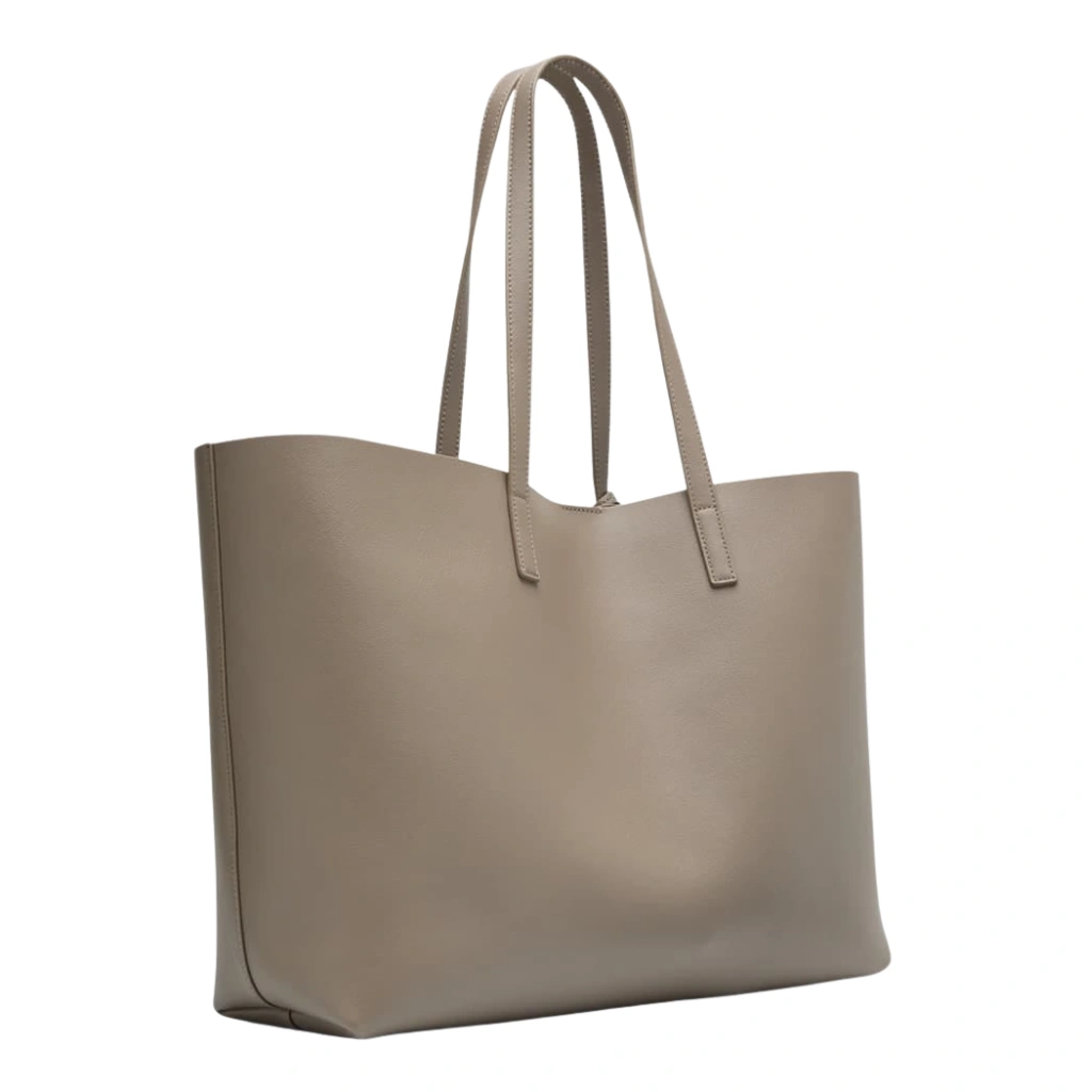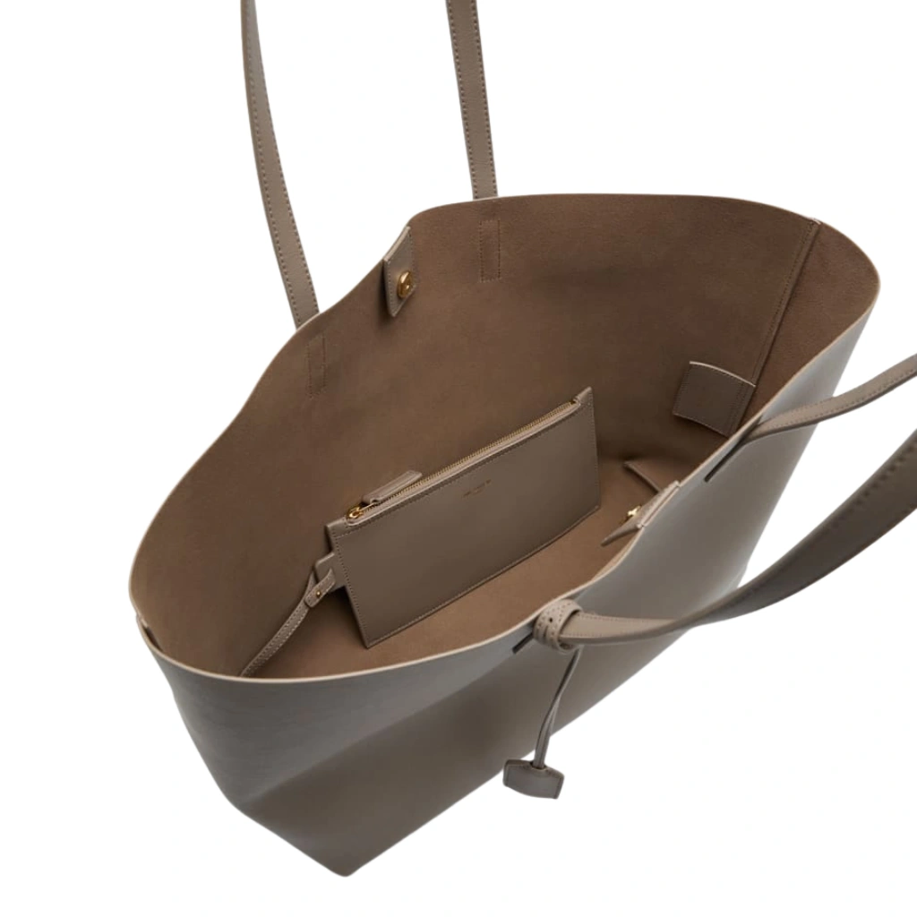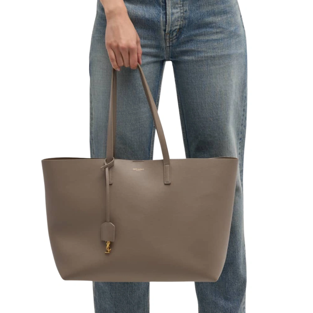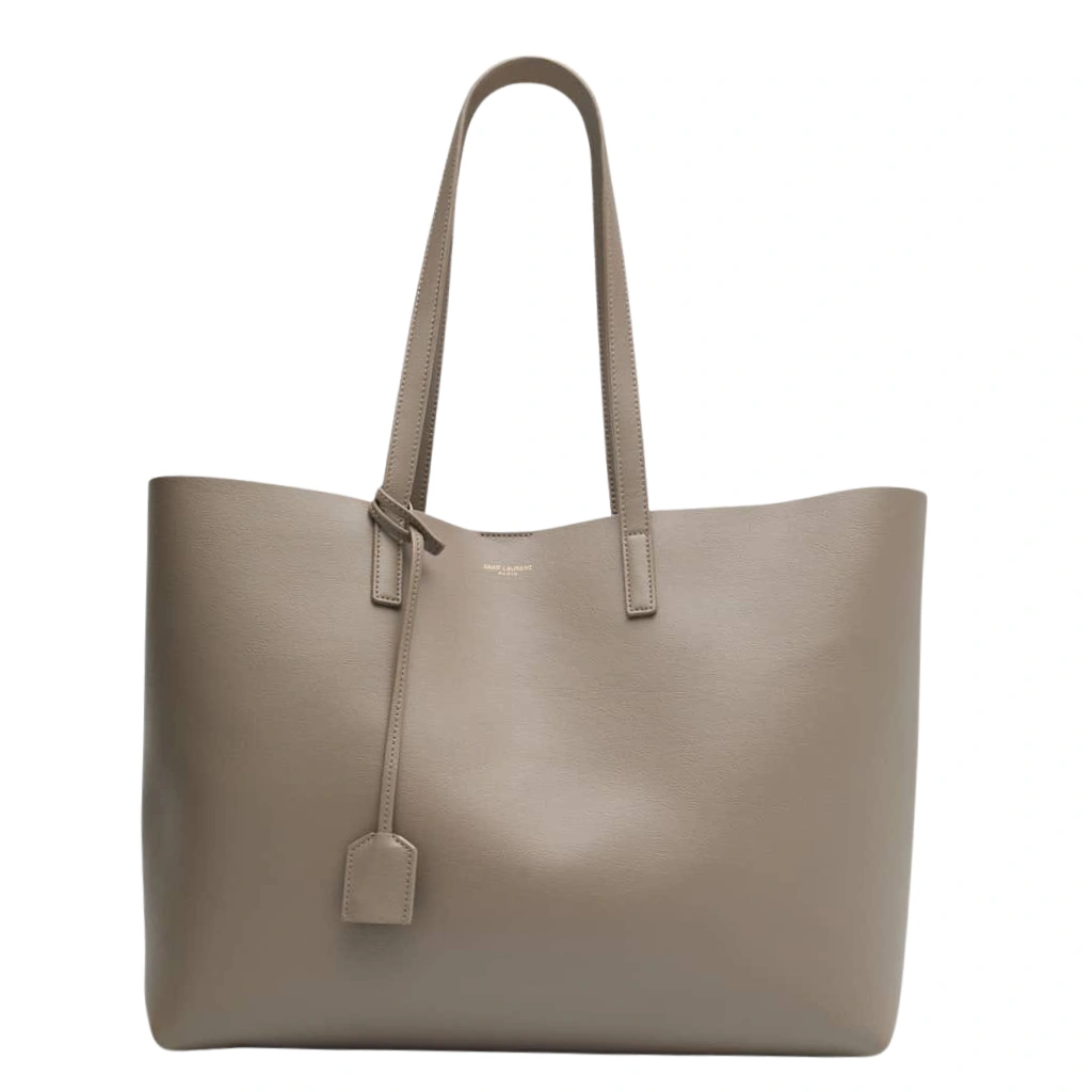 Expertly crafted in Italy from durable grained calfskin leather in an elegant grey tone, this Saint Laurent East West Shopping Tote embodies understated luxury and modern minimalism. The clean, structured silhouette is accented with slim rolled leather top handles, subtle gold-stamped Saint Laurent Paris logo lettering, and a removable leather clochette for a refined signature finish. Designed for everyday sophistication, the spacious open interior offers effortless functionality, making this tote an ideal companion for work, travel, or daily essentials with timeless Parisian appeal.